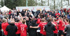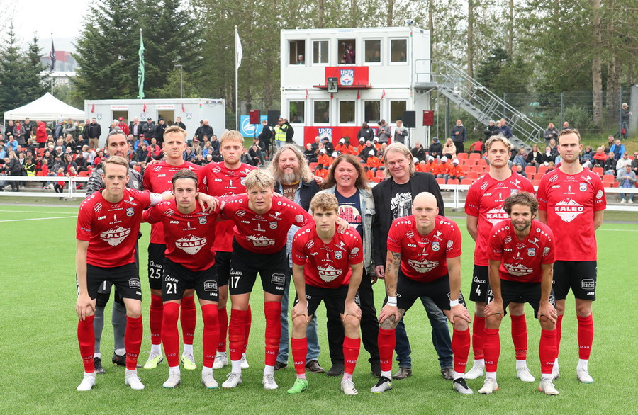 Hljómsveitarmeðlimir Gildrunnar eru heiðursgestir kvöldsins og taka í hendur á leikmönnum.