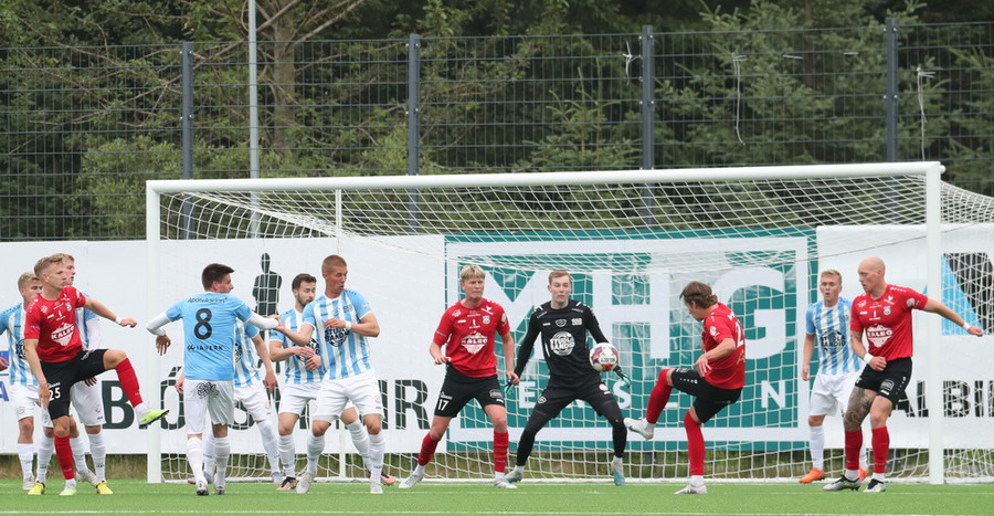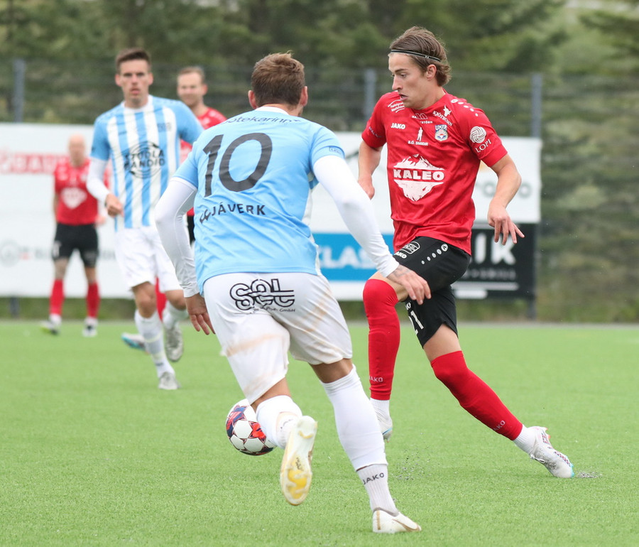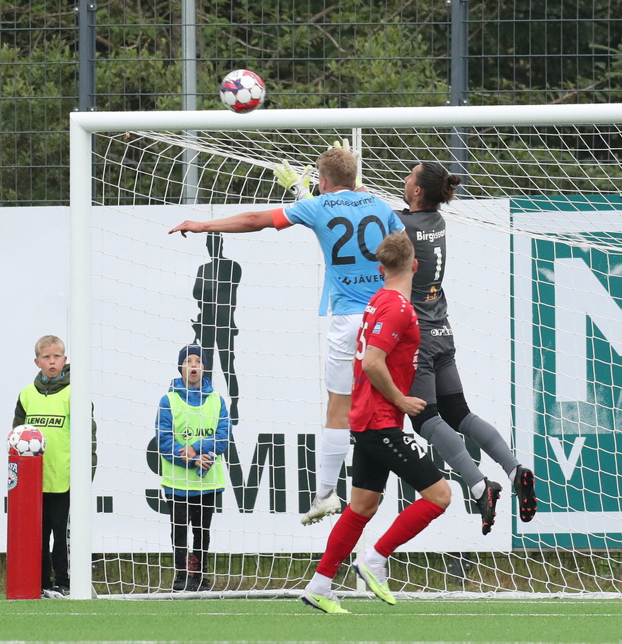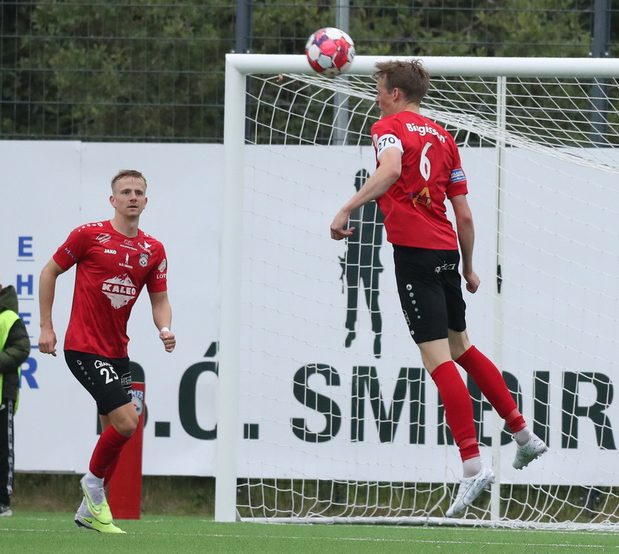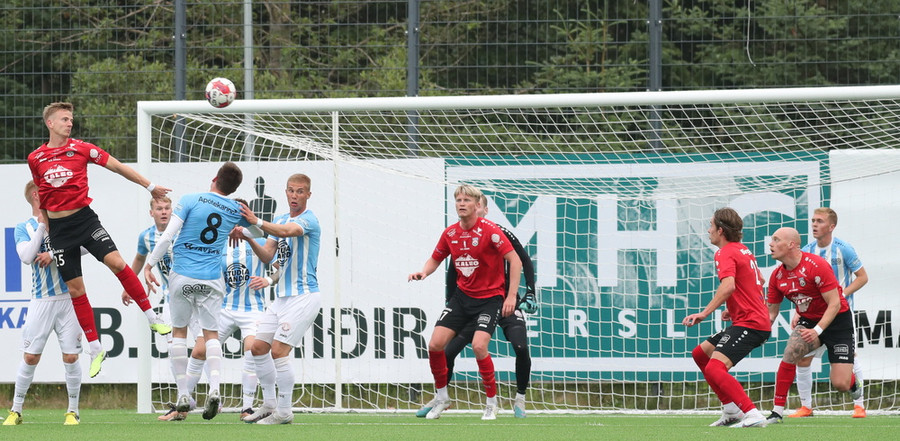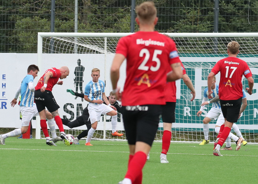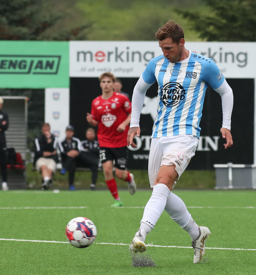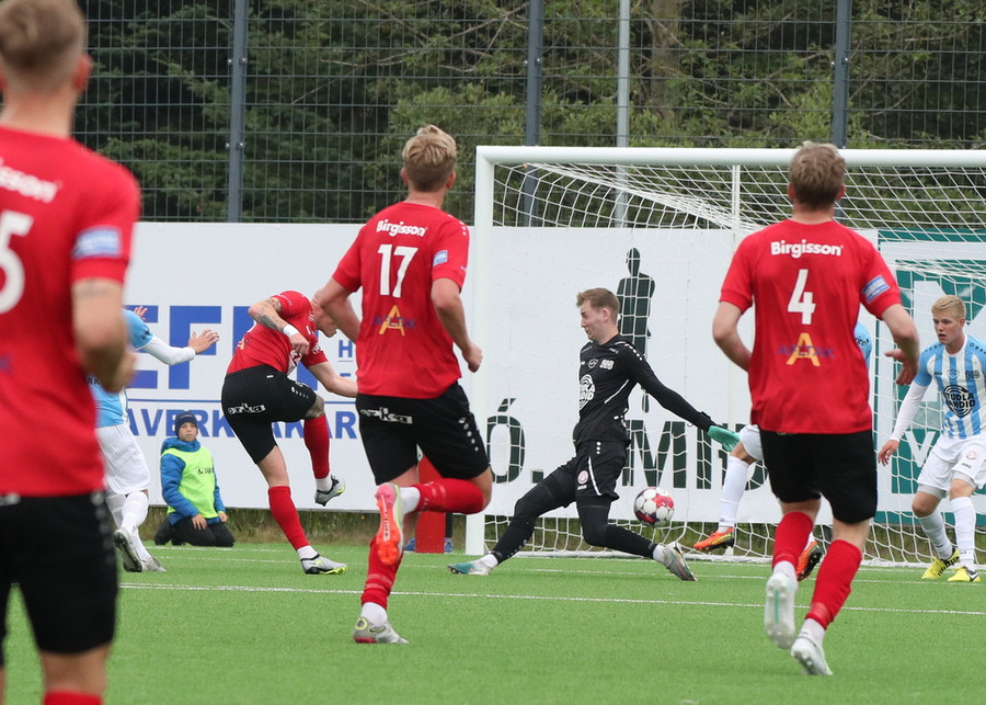 Valdimar Jóhanns á gott skot úr aukaspyrnu en boltinn endar rétt yfir marki heimamanna.