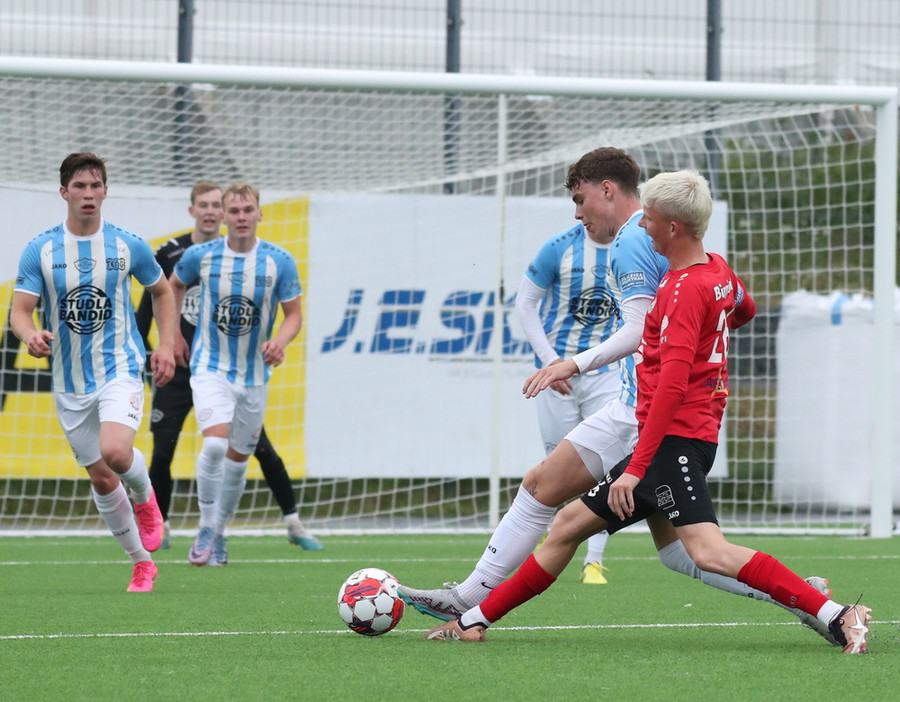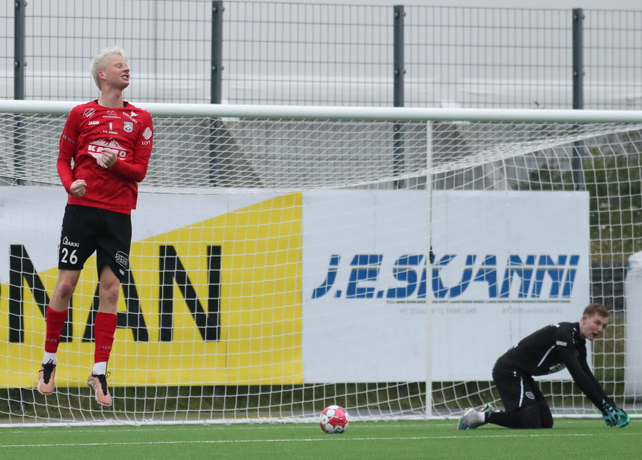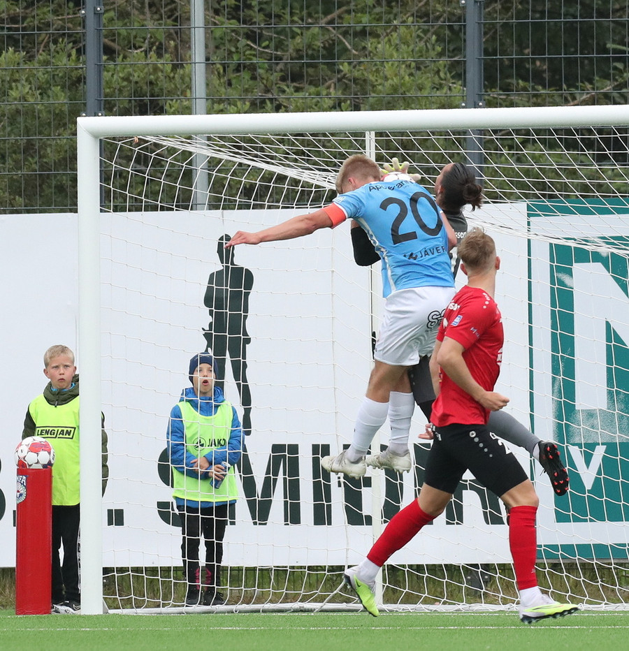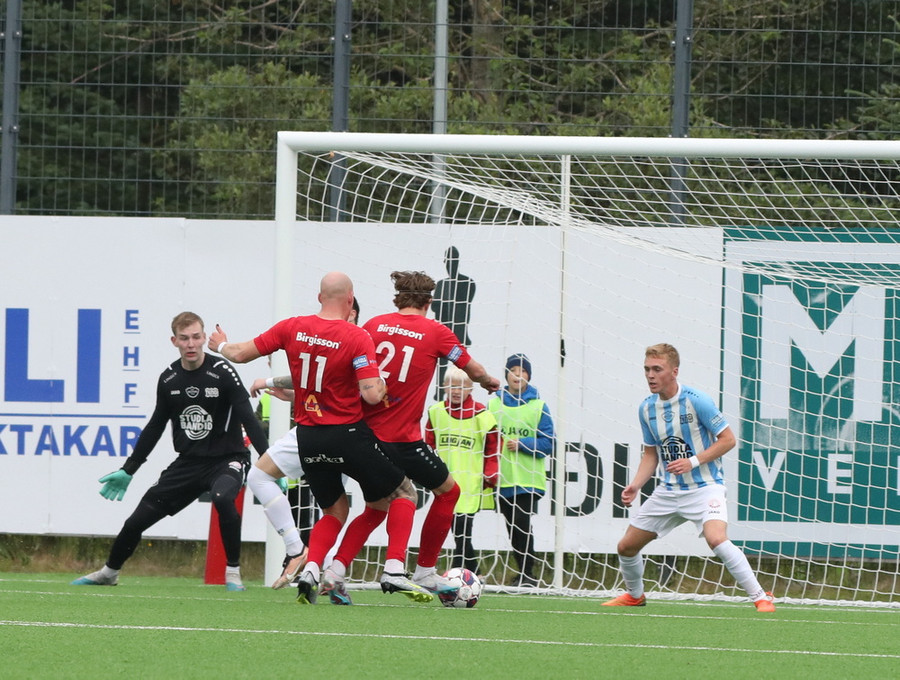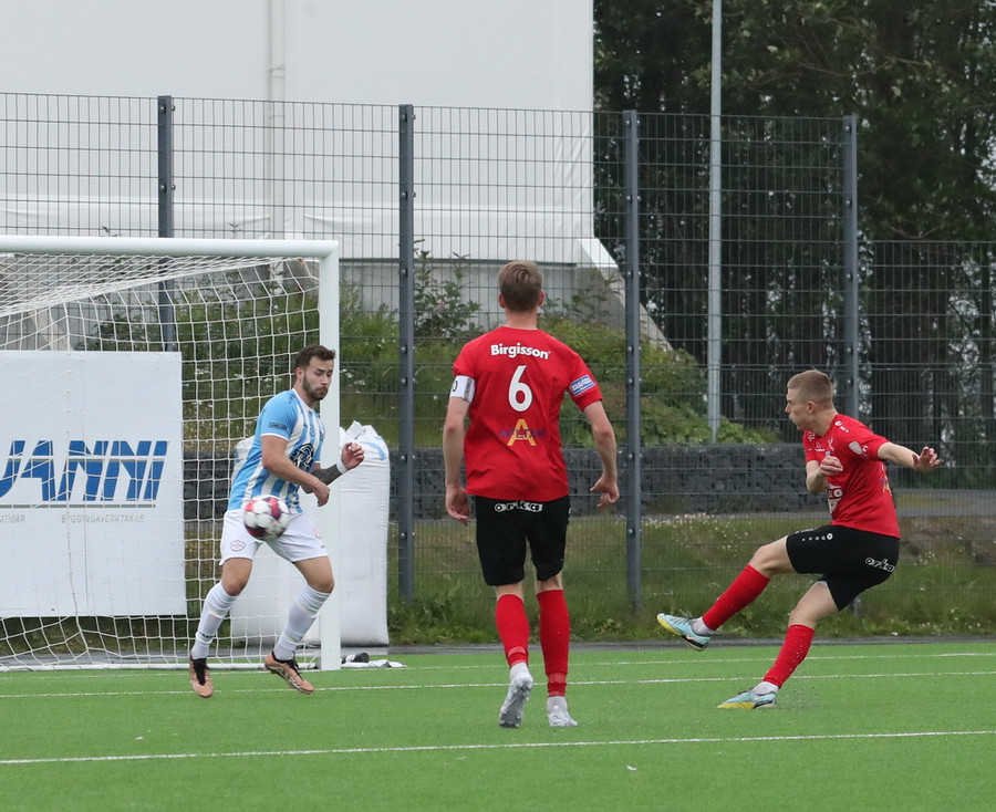 Það kemur hár bolti í teiginn, Stefán Þór æðir út en Arnór Gauti þvælist fyrir honum. Boltinn fer í Stefán og svo beint á Ásgeir Marteins sem setur boltann í stöngina og inn!