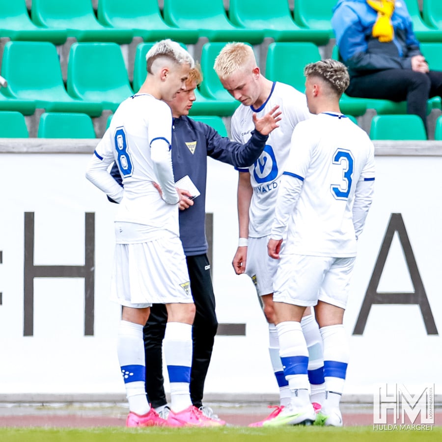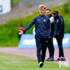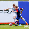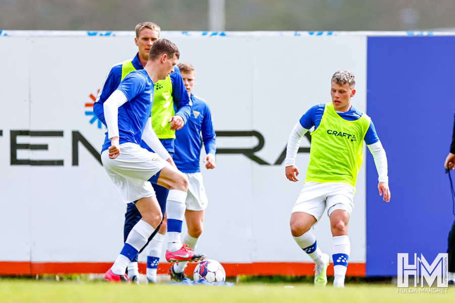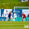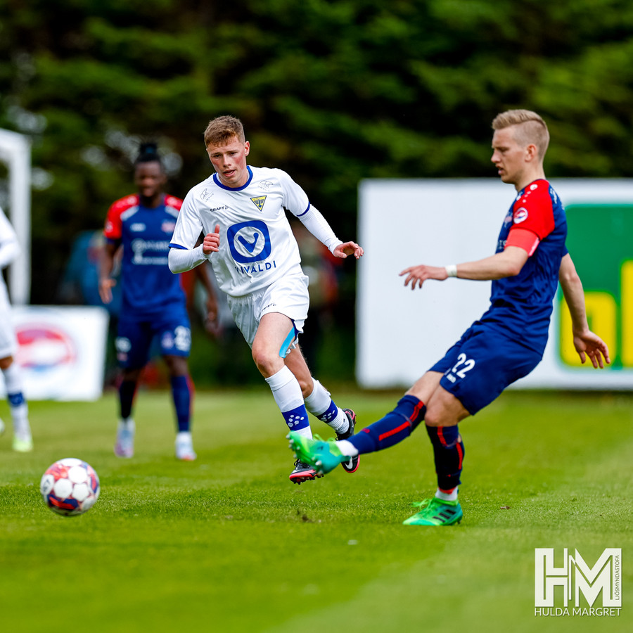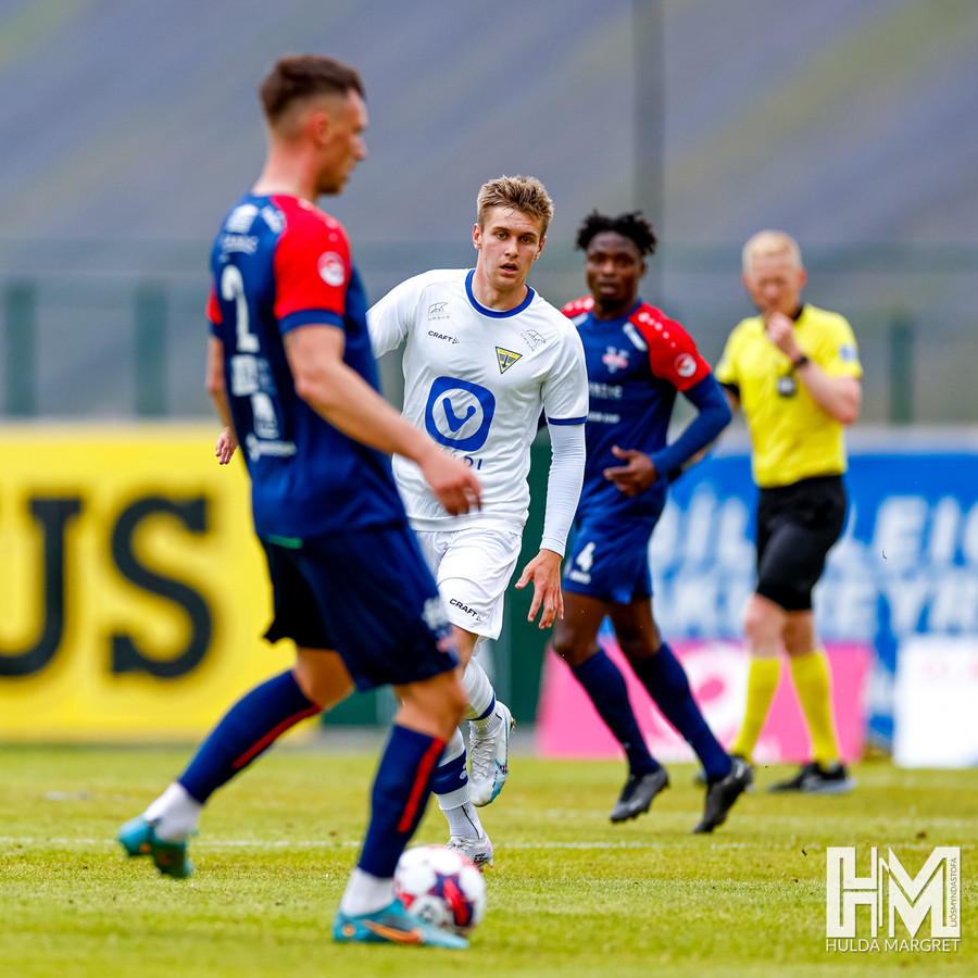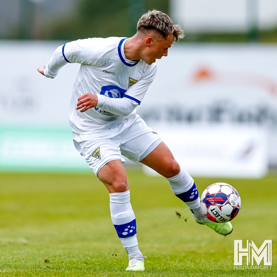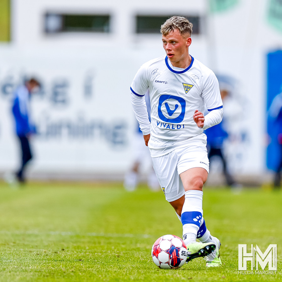 Hornið berst til Gustav Kjeldsen sem dregur boltann vel framhjá.