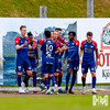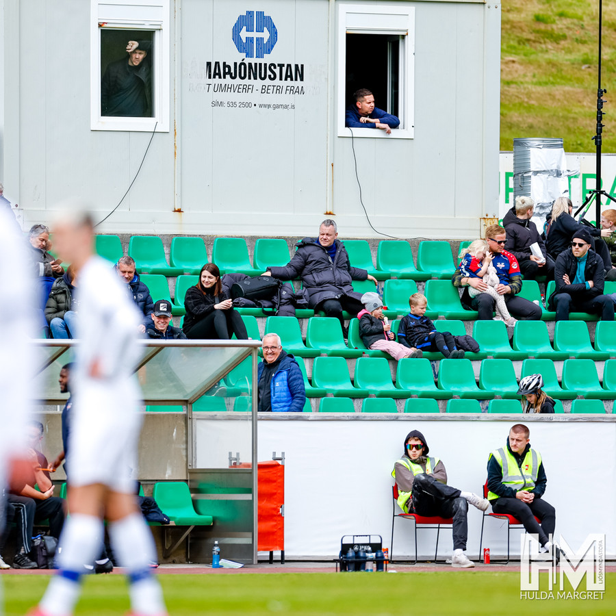 Liðin ganga inn á völlinn og gengur það vel. Grótta eru í alhvítum varabúningum en Vestramenn eru í sínum dökkbláu.