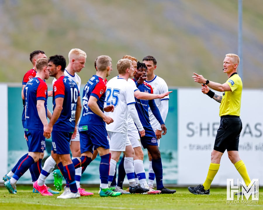 Arnar Þór brýtur á Tufa og heimamenn reiðir. Aron Bjarki ekki sáttur og skammar dómarann.