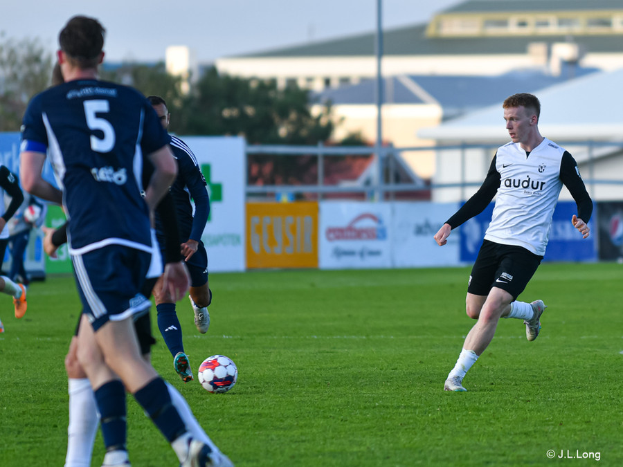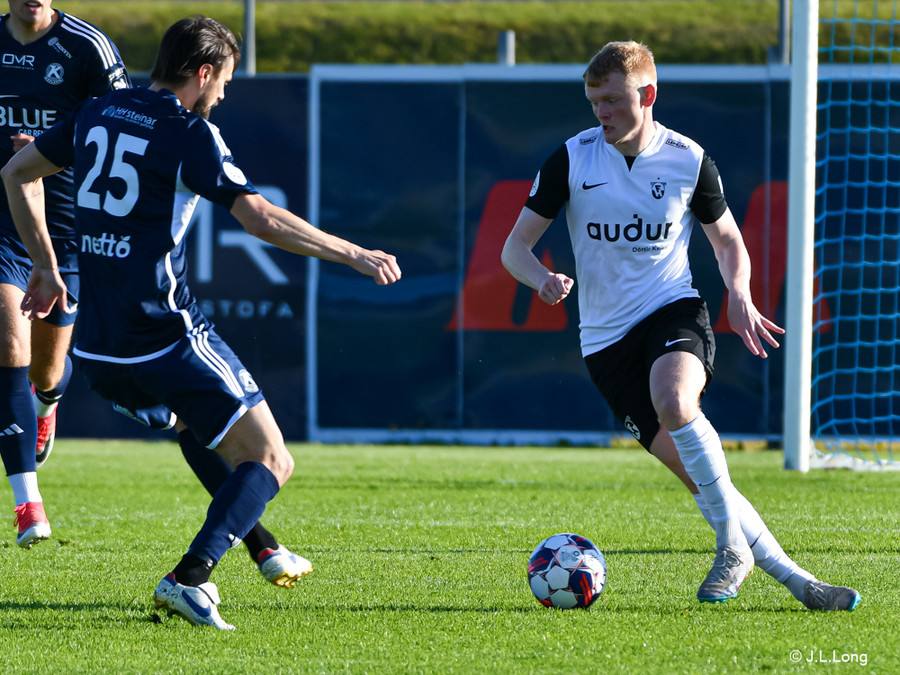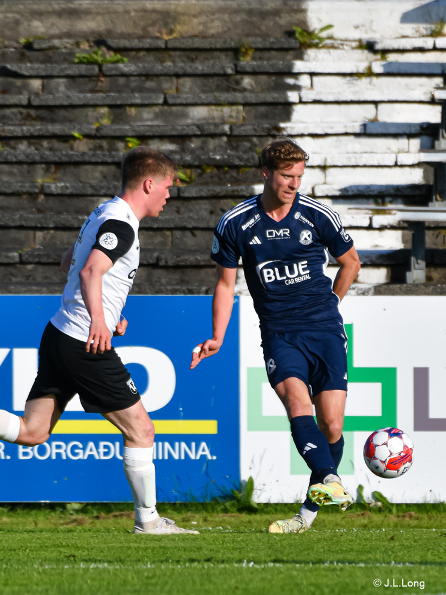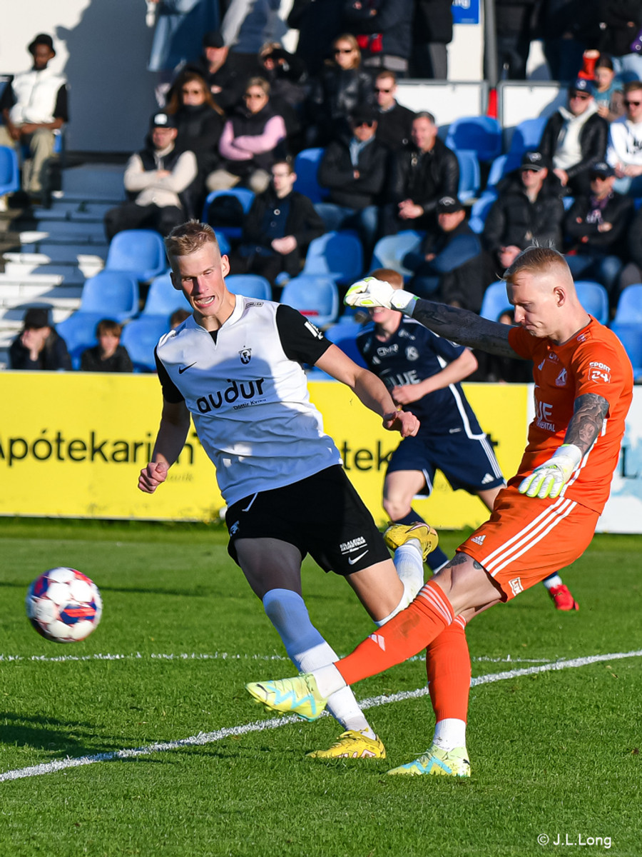 Úlfur Ágúst snýr Ásgeir Pál af sér eftir laglega skyndisókn, hleður í skotið og Mathias ver.
