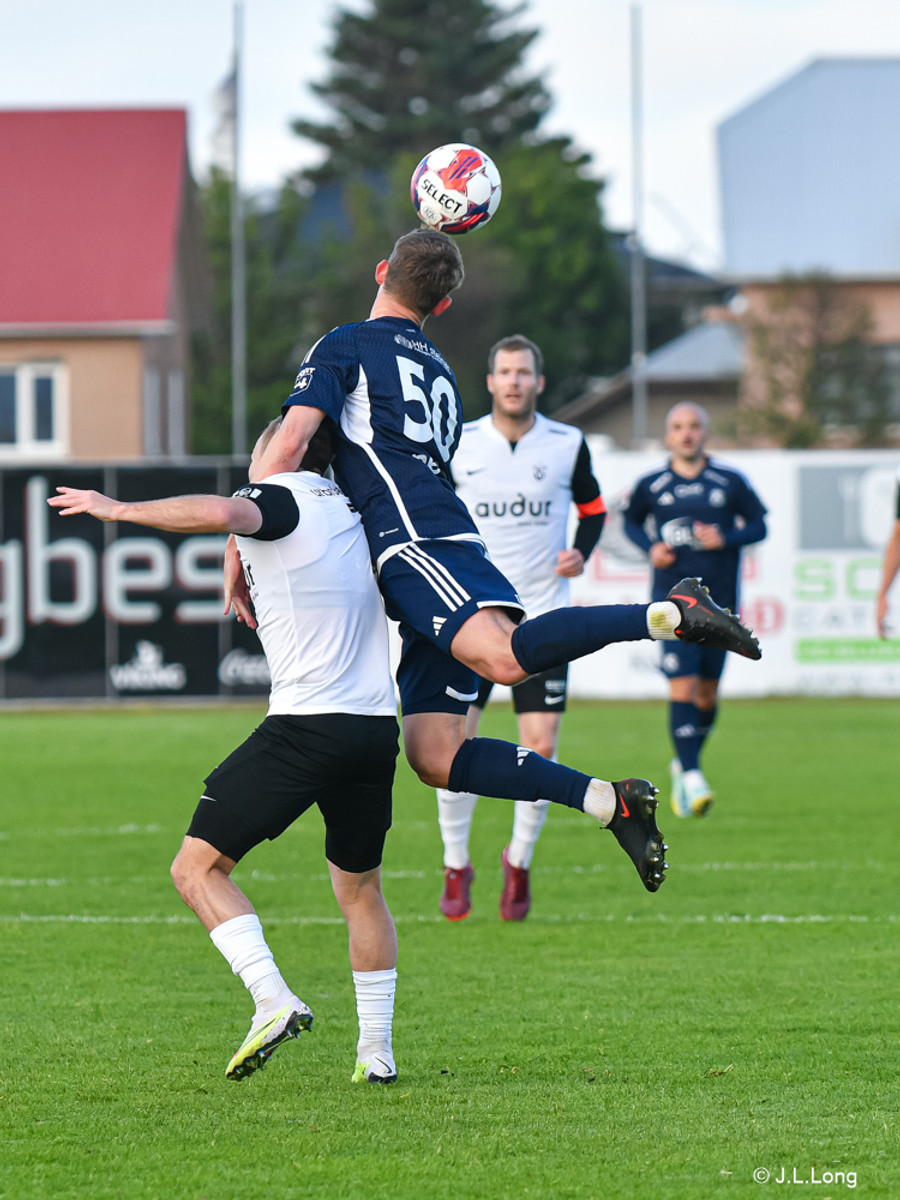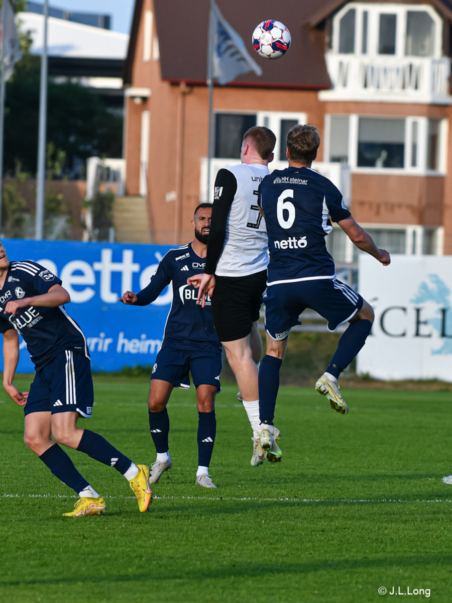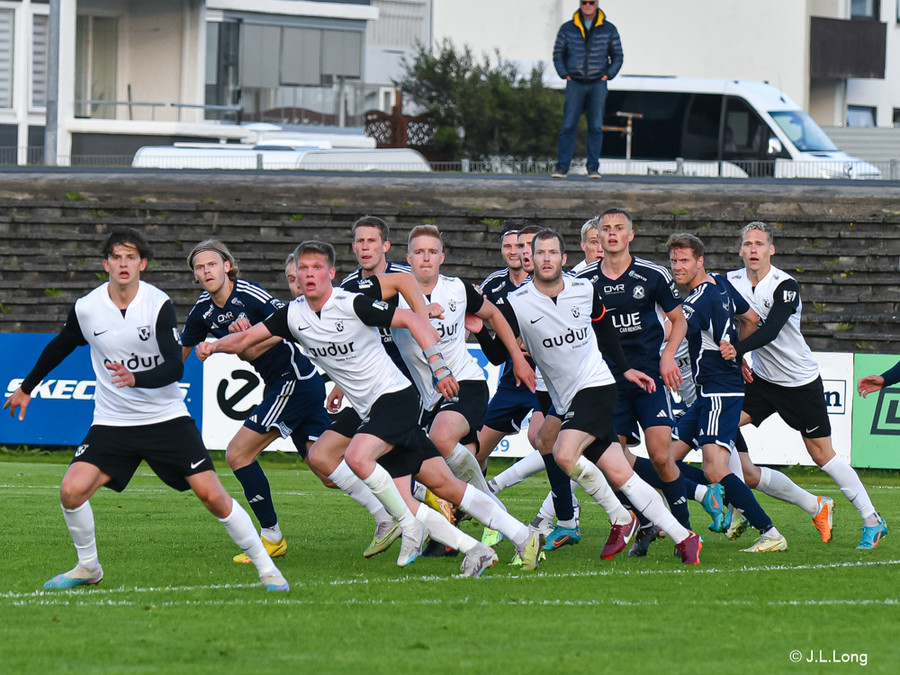 Boltinn á nær, afturfyrir af varnarmanni. Annað horn.