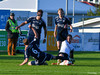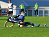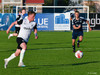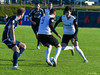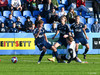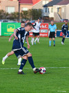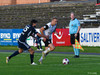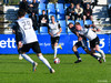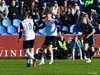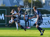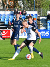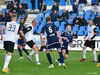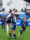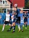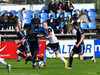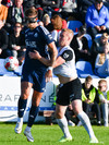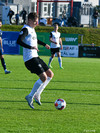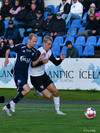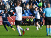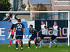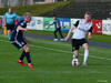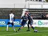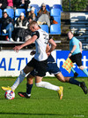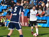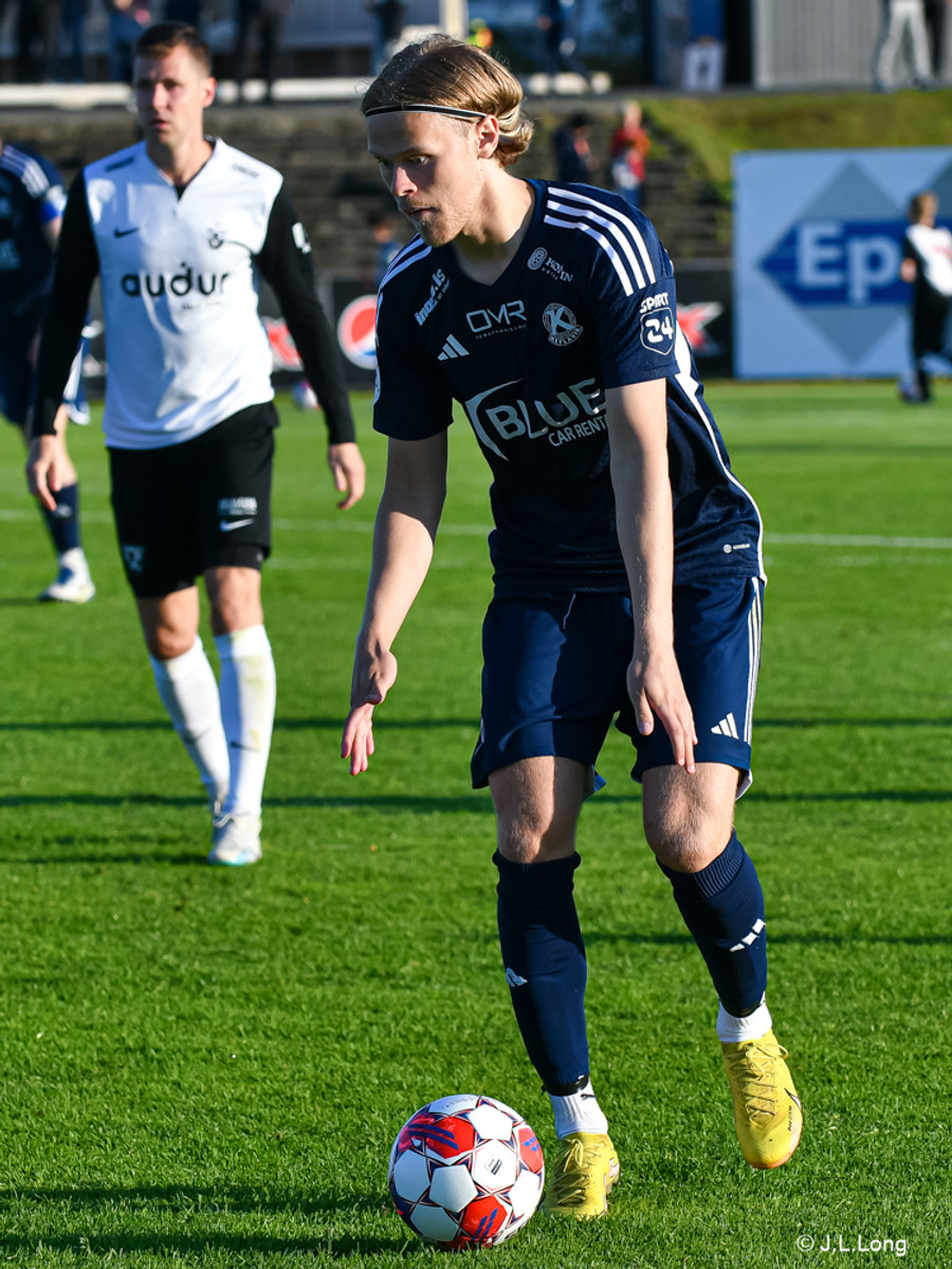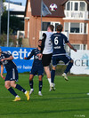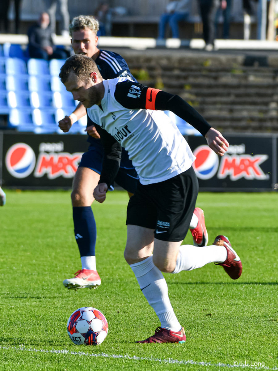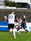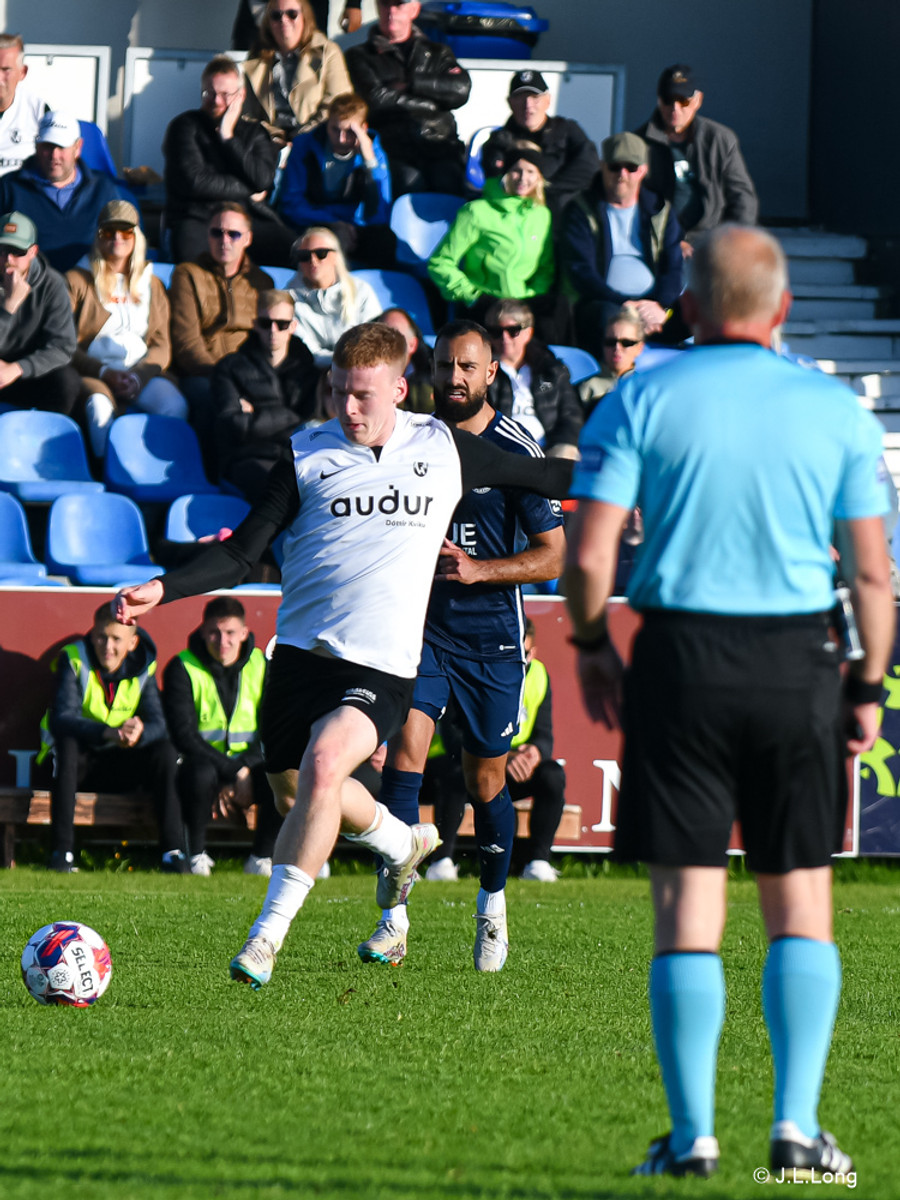Boltinn á nær, afturfyrir af varnarmanni. Annað horn.