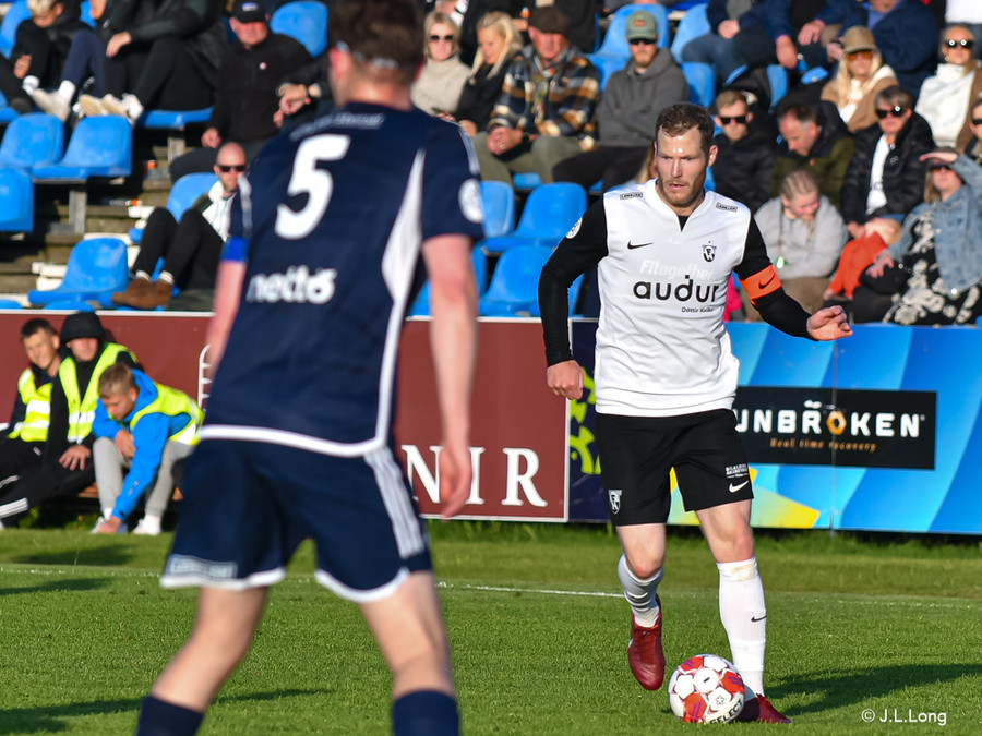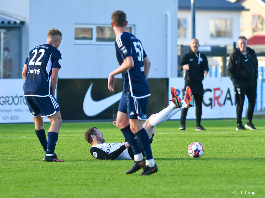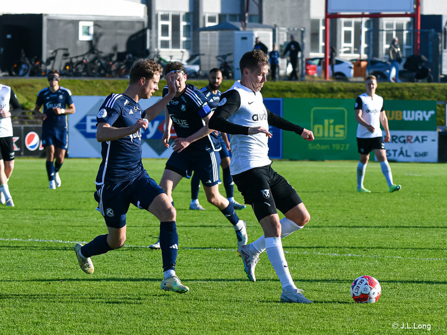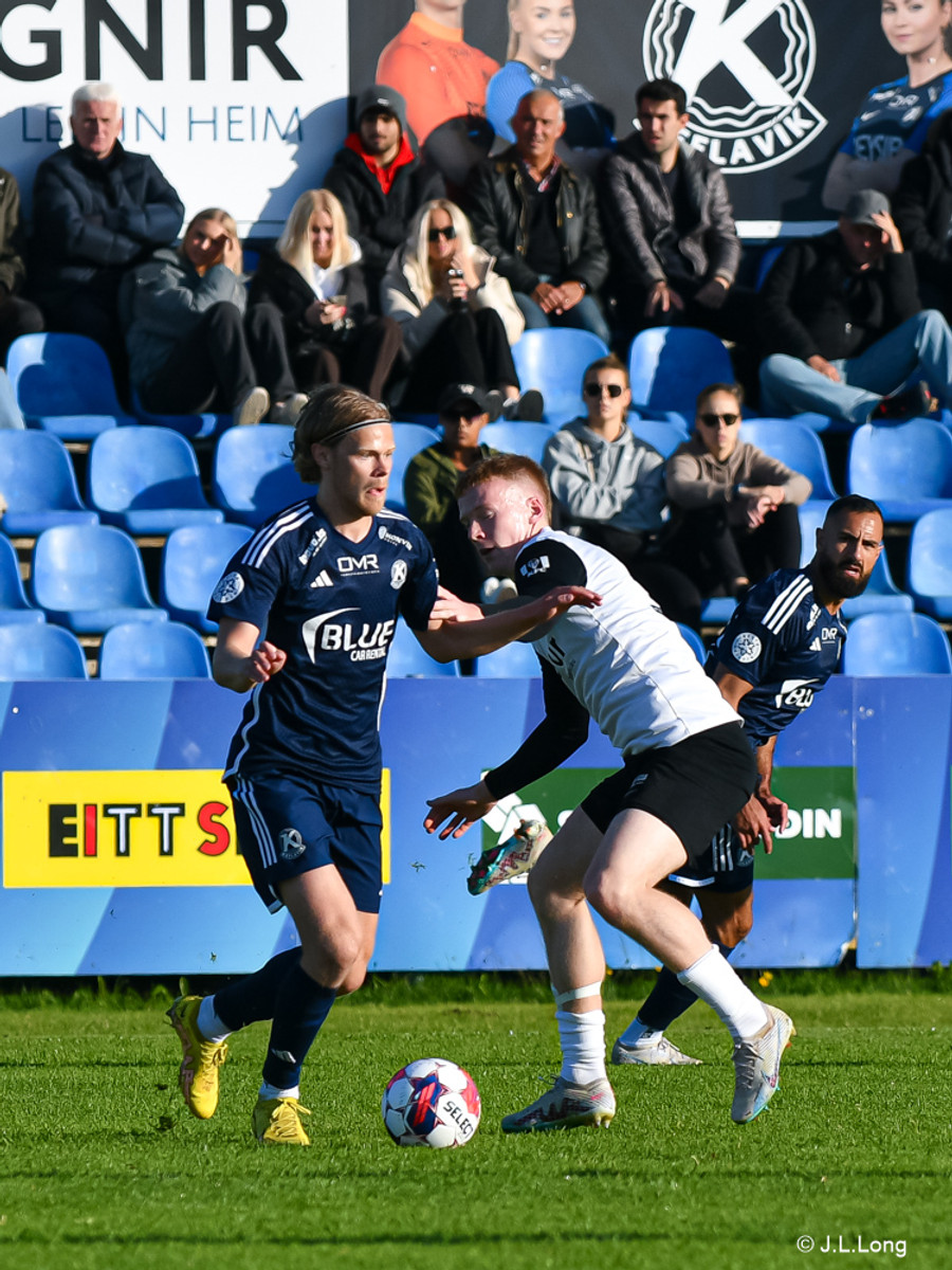 Kjartan Henry hleður í eitt mjög gott "Æ" þegar hann fær Sindra Snæ í bakið. Klár aukaspyrna og Erlendur á sama máli.