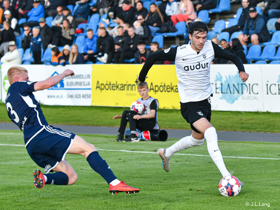 Áður en að færi Keflvíkur kom áðan hafði Vuk líkt og stundum áður stigið dans við vítateig Keflavíkur og farið illa með Azel Inga þar. Fann Björn Daníel sem átti skot í varnarmann.