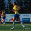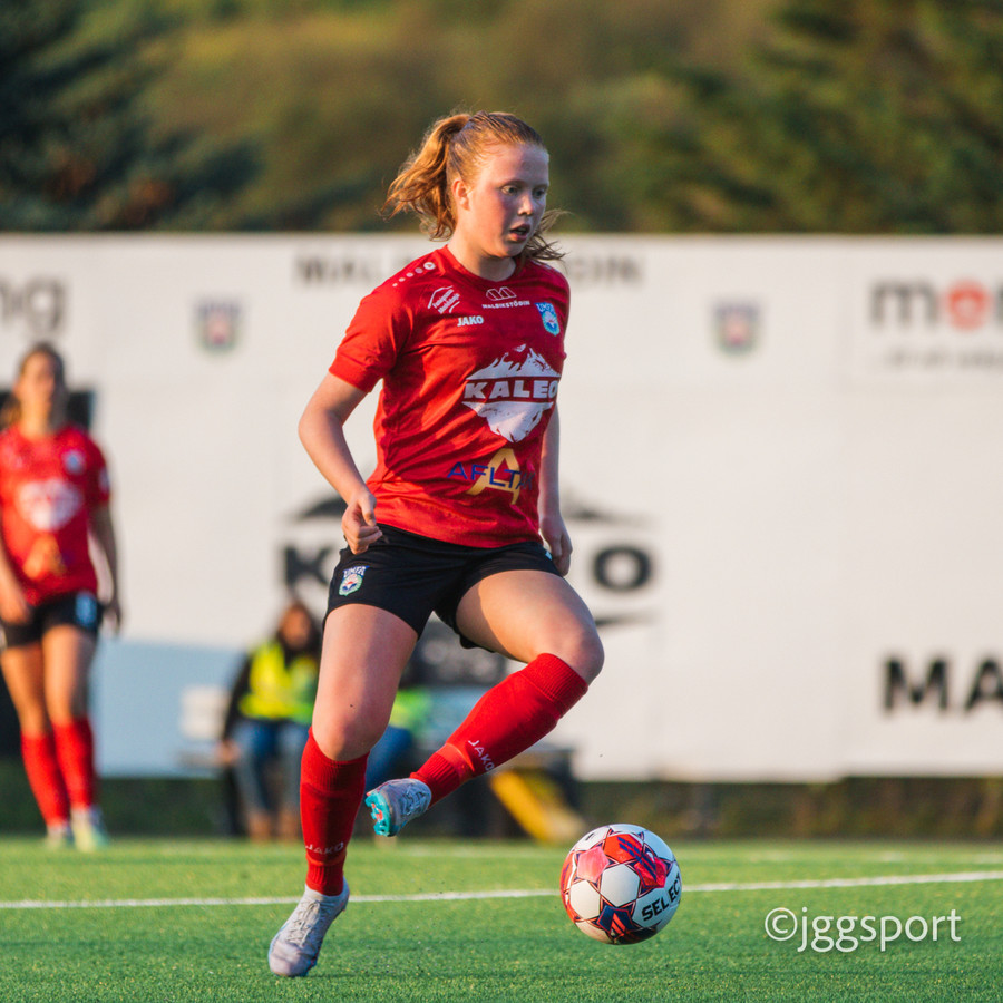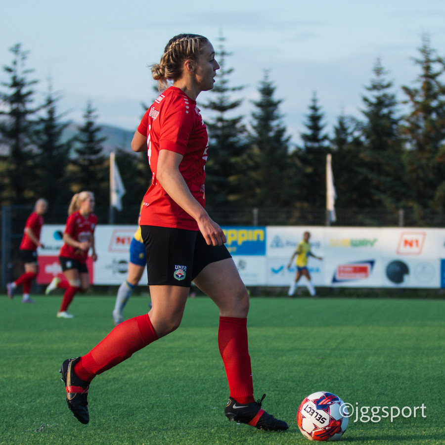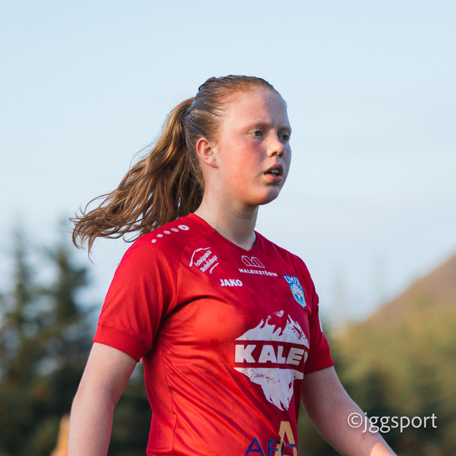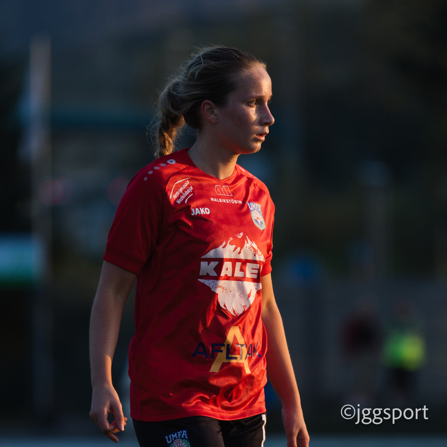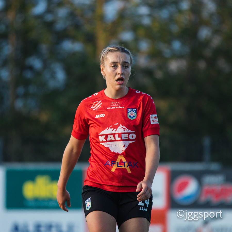 Hlín Heiðars þarf aðhlynningu og leikurinn er stöðvaður í smá stund. Hún röltir út fyrir völlinn og virðist hafa lokið leik í kvöld.