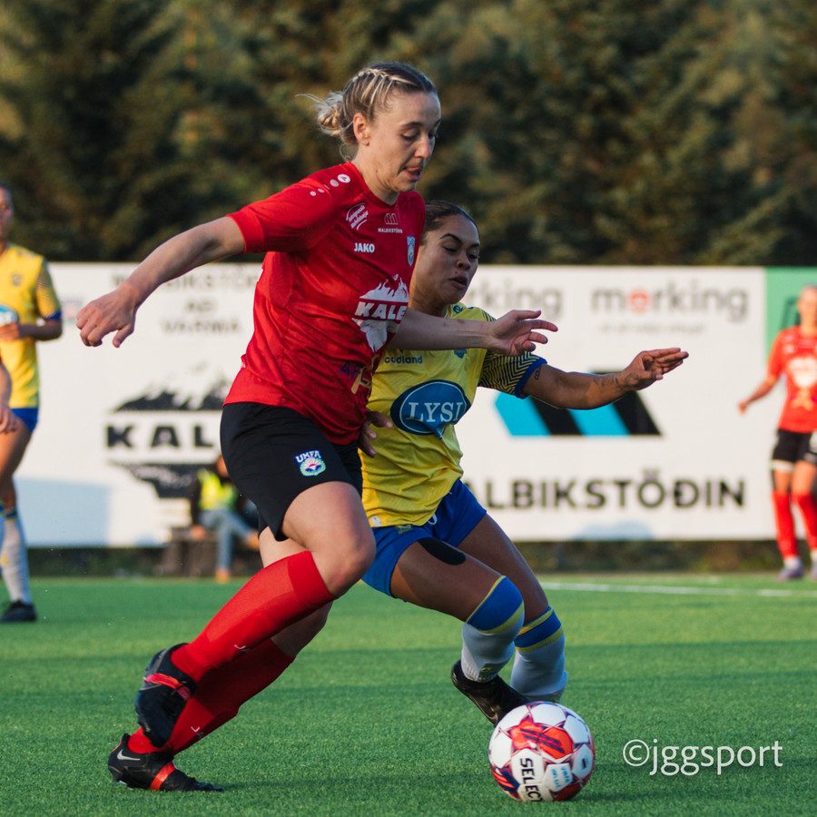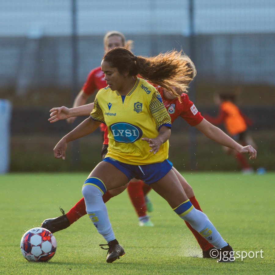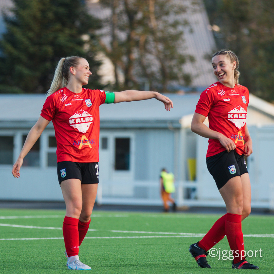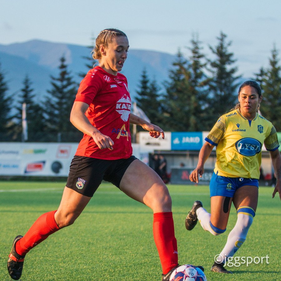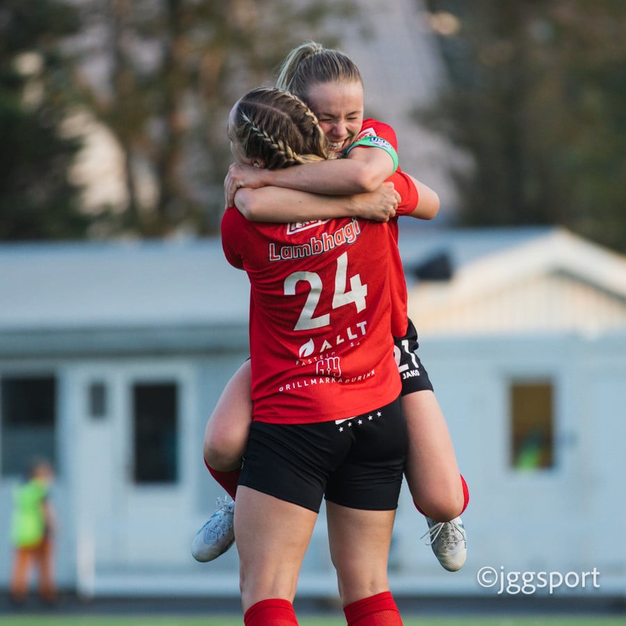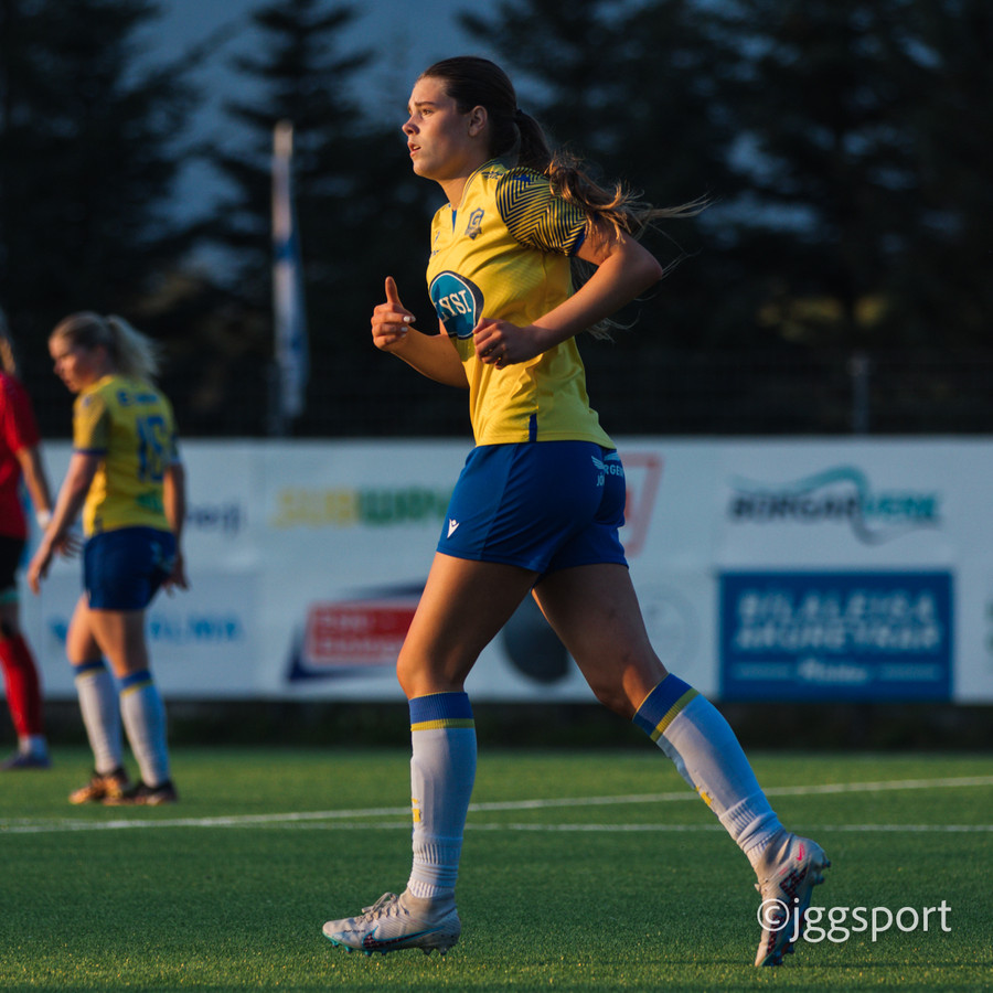 Góð sókn hjá heimakonum og Guðrún Embla reynir skot í teignum eftir fyrirgjöf, boltinn ratar ekki á markið en berst fyrir fæturna á Maya Camille sem getur ekki annað en komið boltanum yfir línuna!