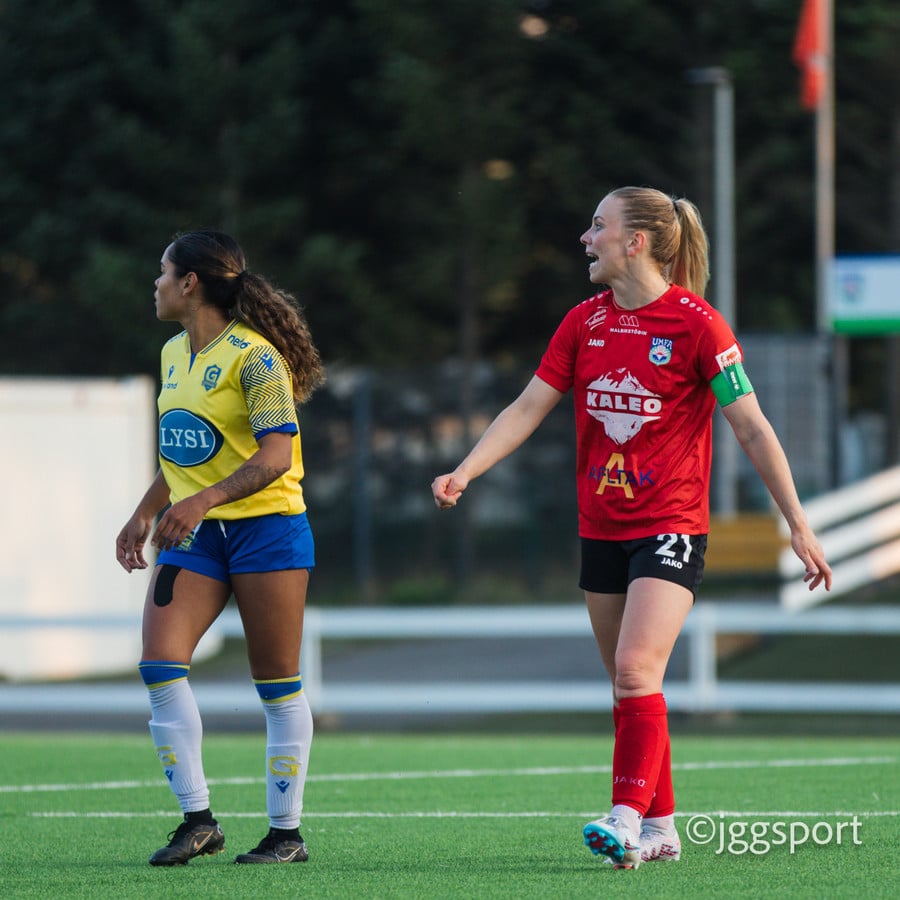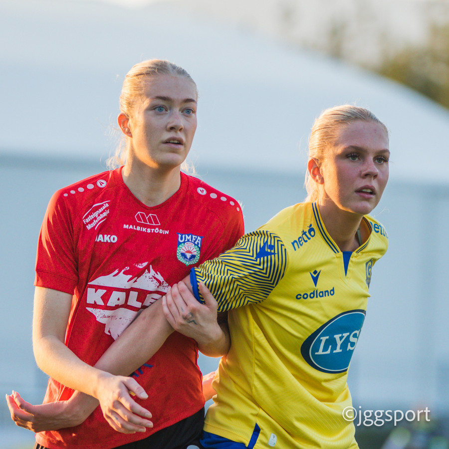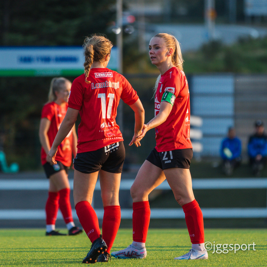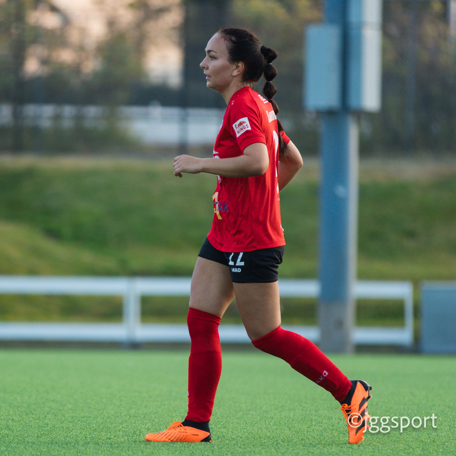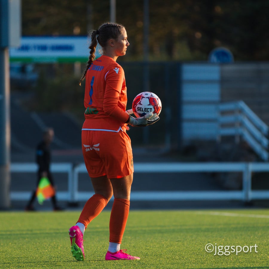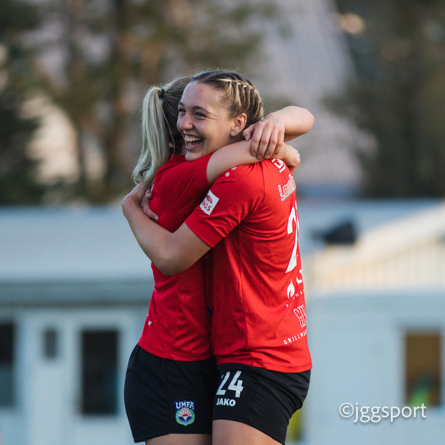 Góð sókn hjá heimakonum og Guðrún Embla reynir skot í teignum eftir fyrirgjöf, boltinn ratar ekki á markið en berst fyrir fæturna á Maya Camille sem getur ekki annað en komið boltanum yfir línuna!