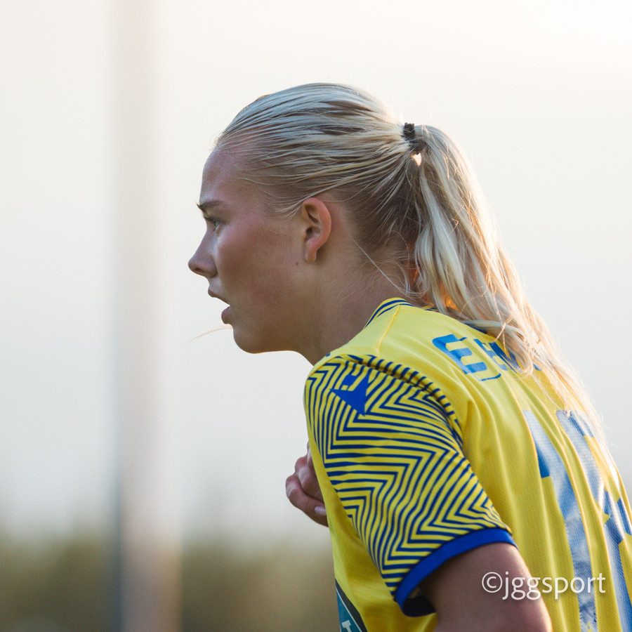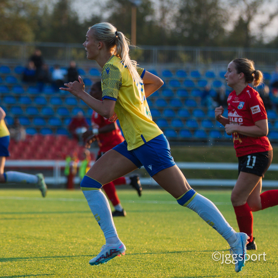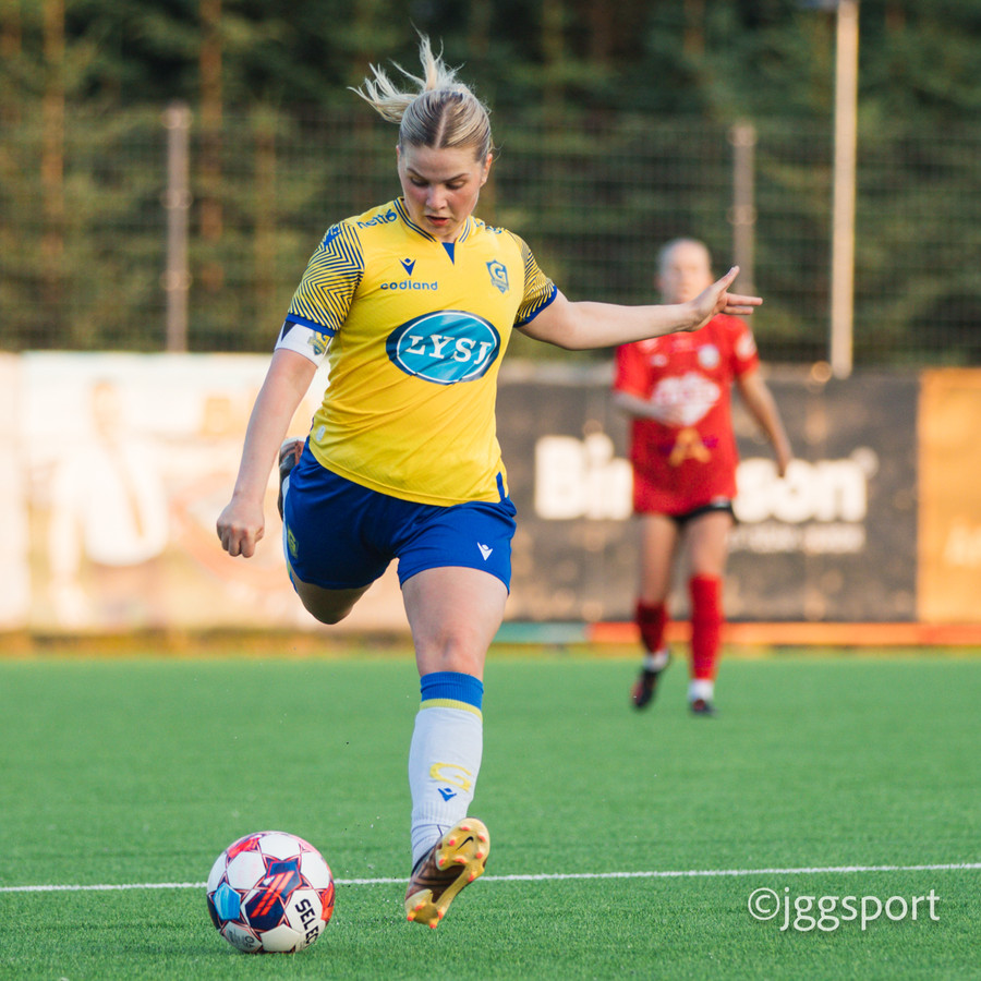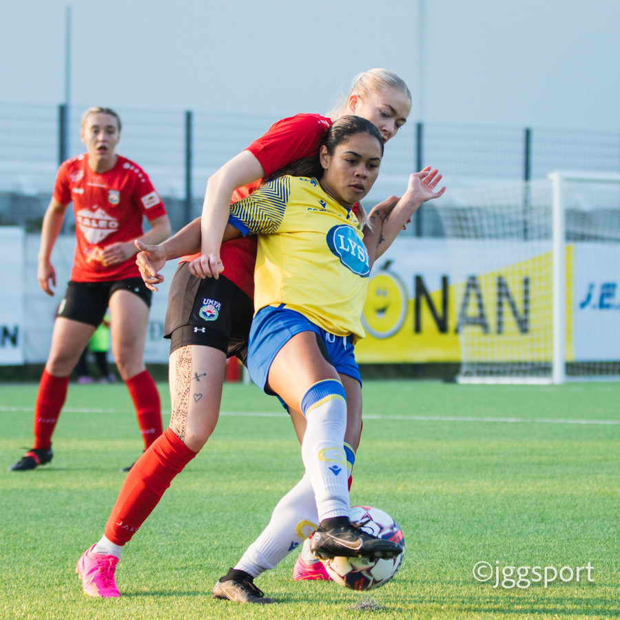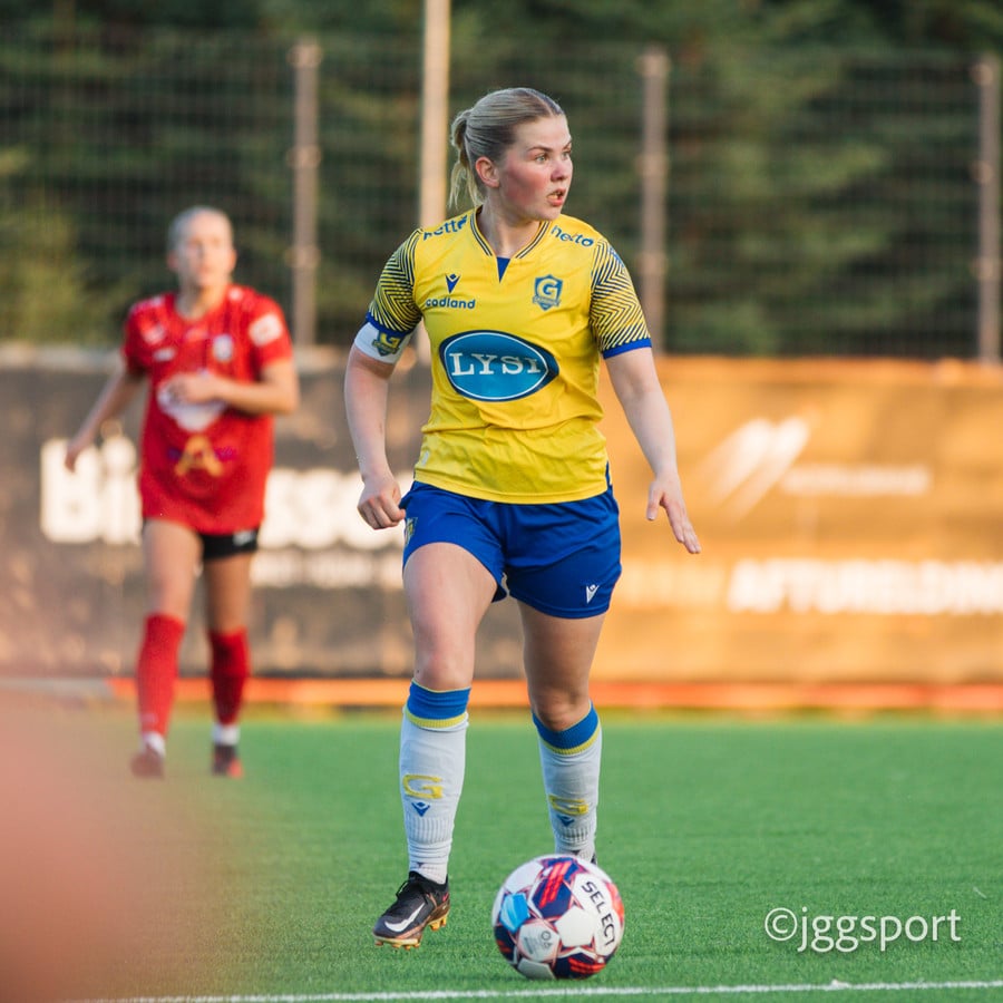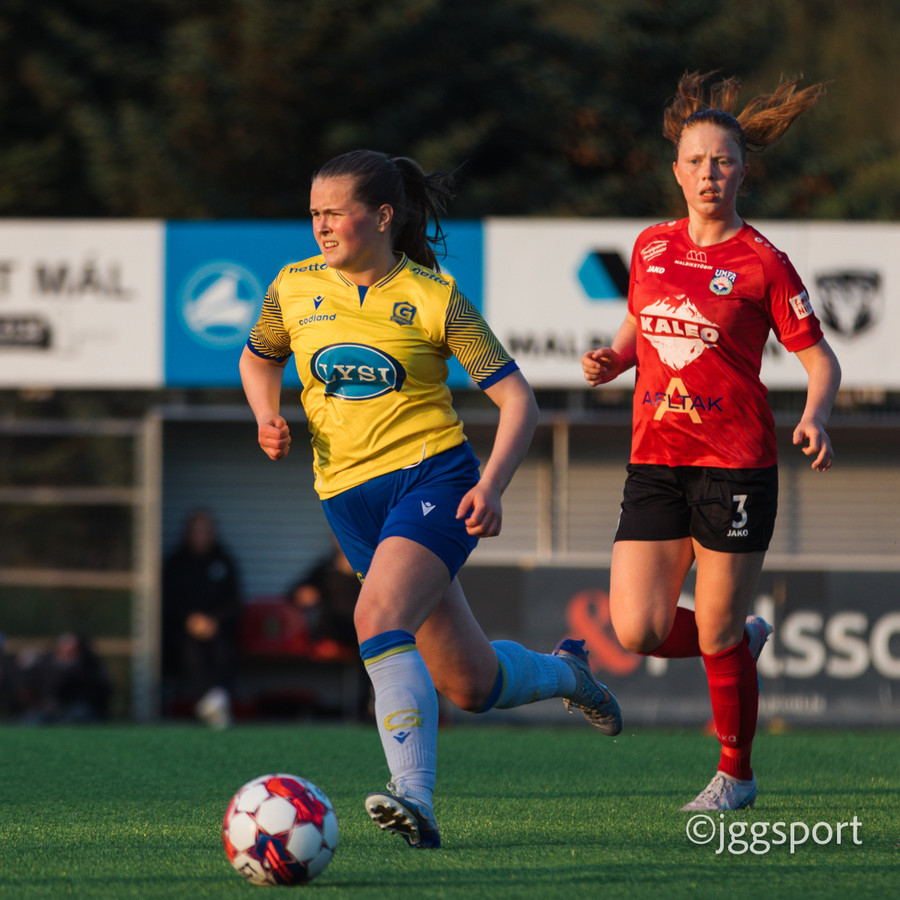 Góð sókn hjá heimakonum og Guðrún Embla reynir skot í teignum eftir fyrirgjöf, boltinn ratar ekki á markið en berst fyrir fæturna á Maya Camille sem getur ekki annað en komið boltanum yfir línuna!