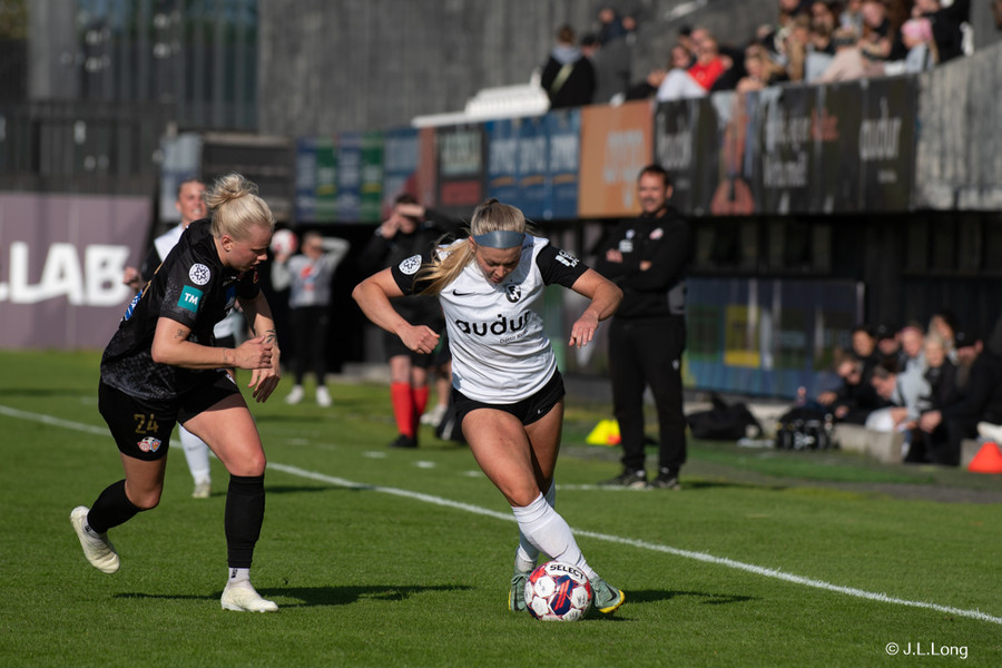 Hulda Ósk æðir að marki FH, Hulda ætlar sér að sóla Aldísi markvörð en Aldís gerir vel og nær að pota í boltann og FH-ingar koma hættunni frá.