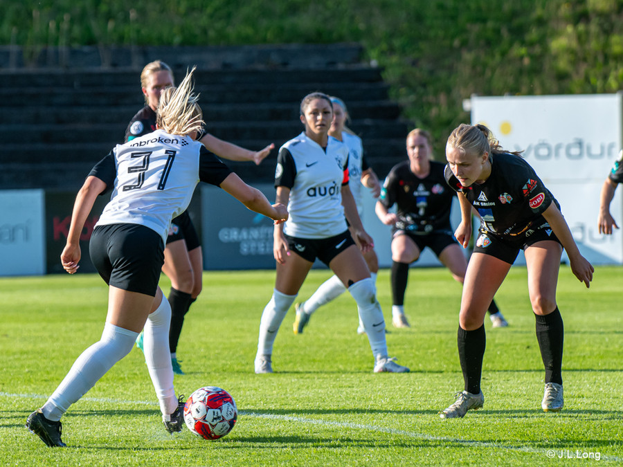 Margrét Árnadóttir á flottan skalla að marki en boltinn fer í varnarmann FH og koma þær svo hættunni frá.