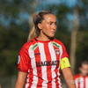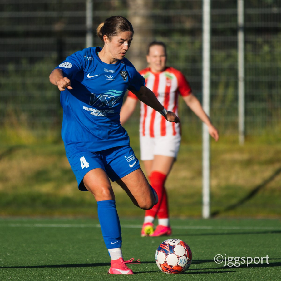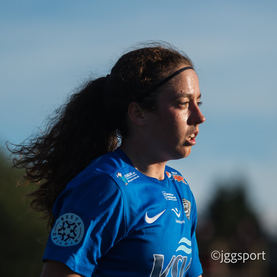 Katla keyrir á vörnina og reynir fyrirgjöf, en Haley Thomas er á réttum stað og kemur boltanum í burtu.