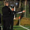 Liðin eru bæði á fullu að hita upp í þessum frábæru aðstæðum hér í Laugardalnum. Dómararnir líka mættir að hita upp og eru hér klæddir í boli sem á stendur "enginn dómari, enginn leikur". Þetta er hluti af herferð sem KSÍ er í.