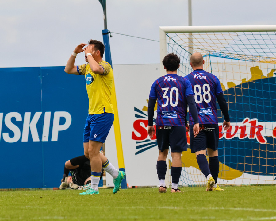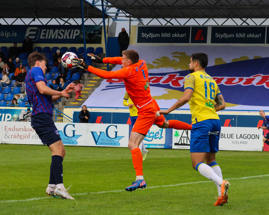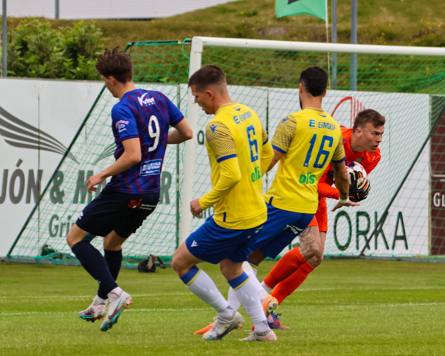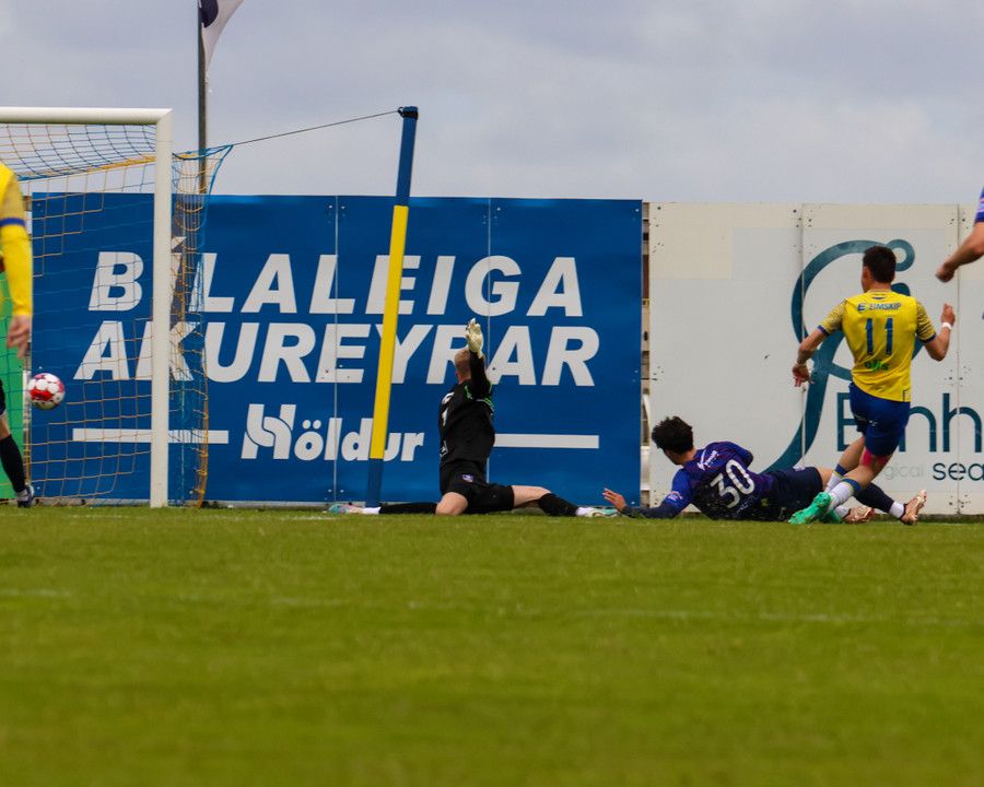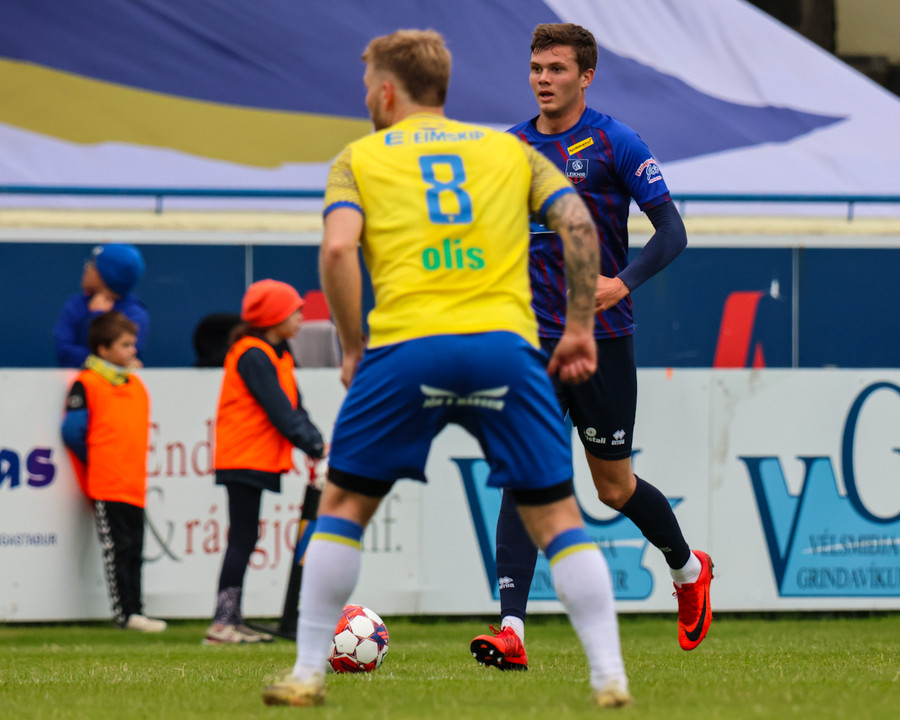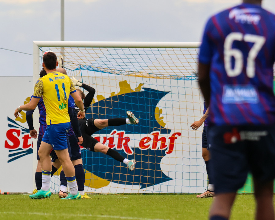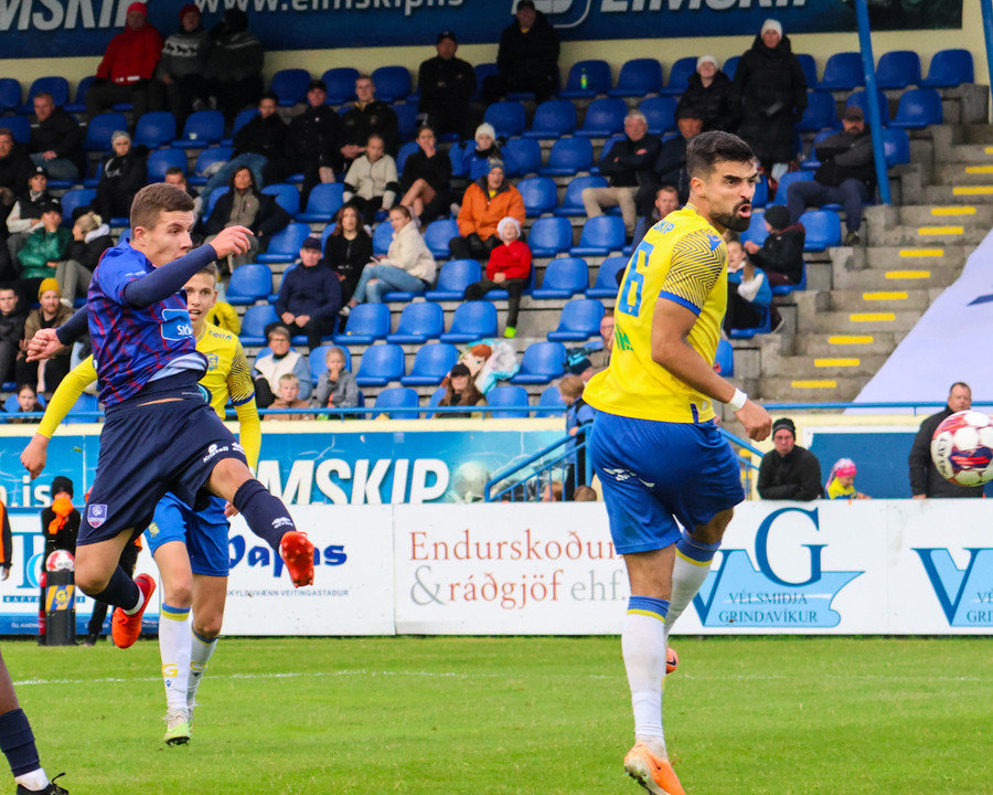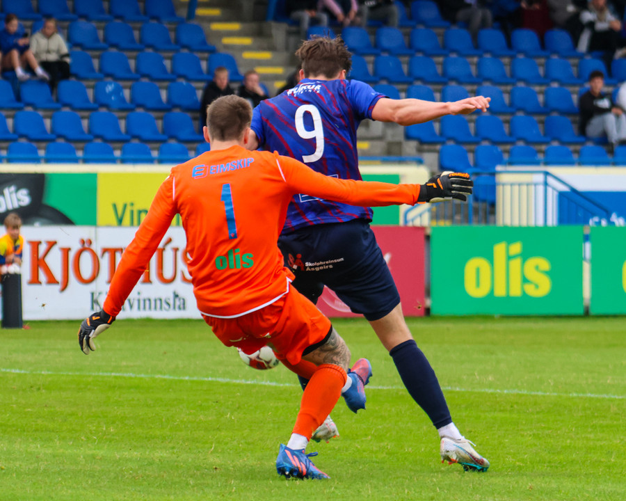Grindvíkingar vinna boltann hátt á vellinum. Tómas Orri hikar ekkert og lætur bara vaða af löngu færi. Viktor ögn framarlega í markinu og missir boltann yfir sig sem smellur í slánni og út.