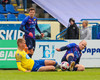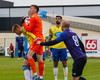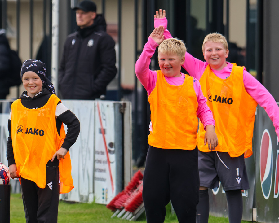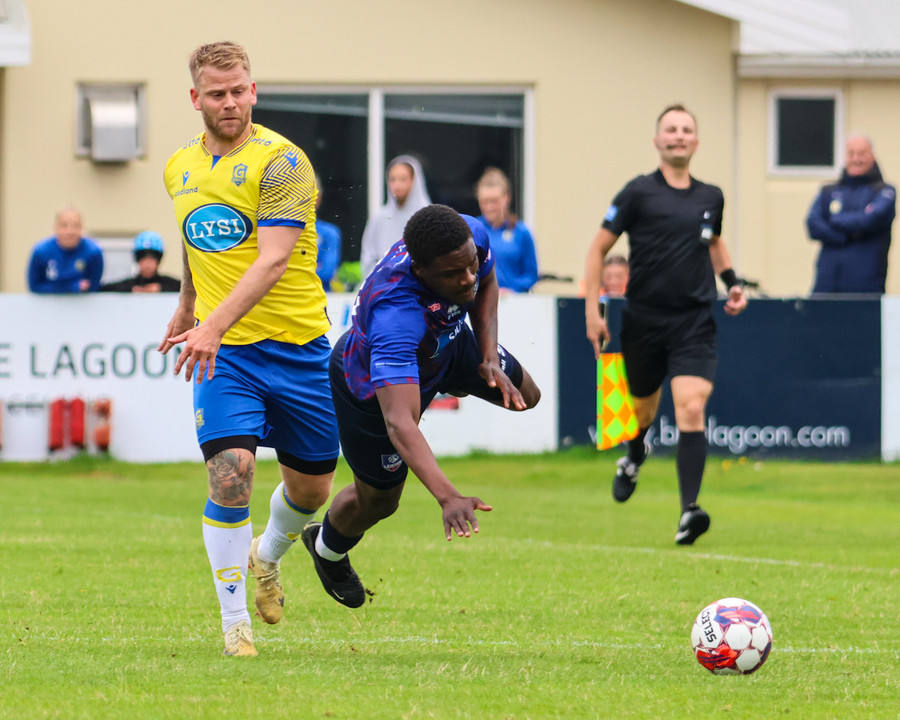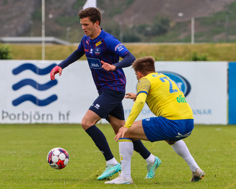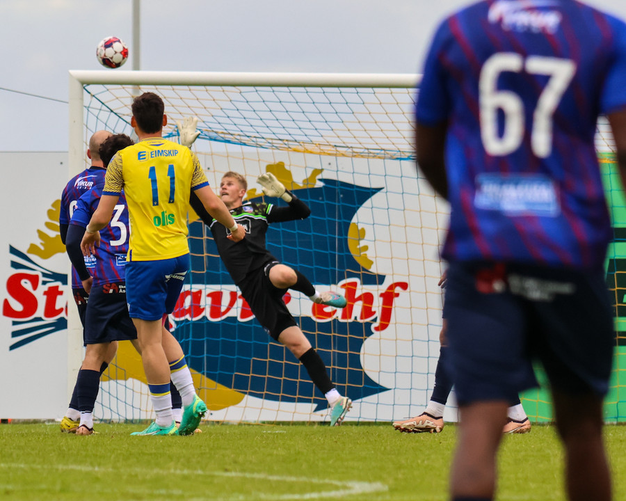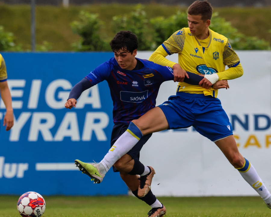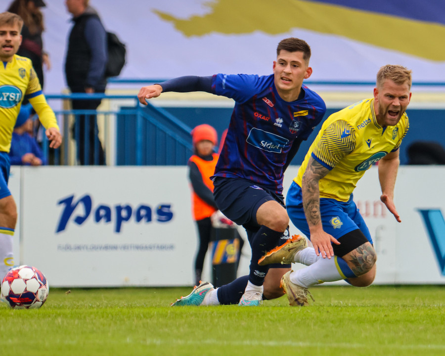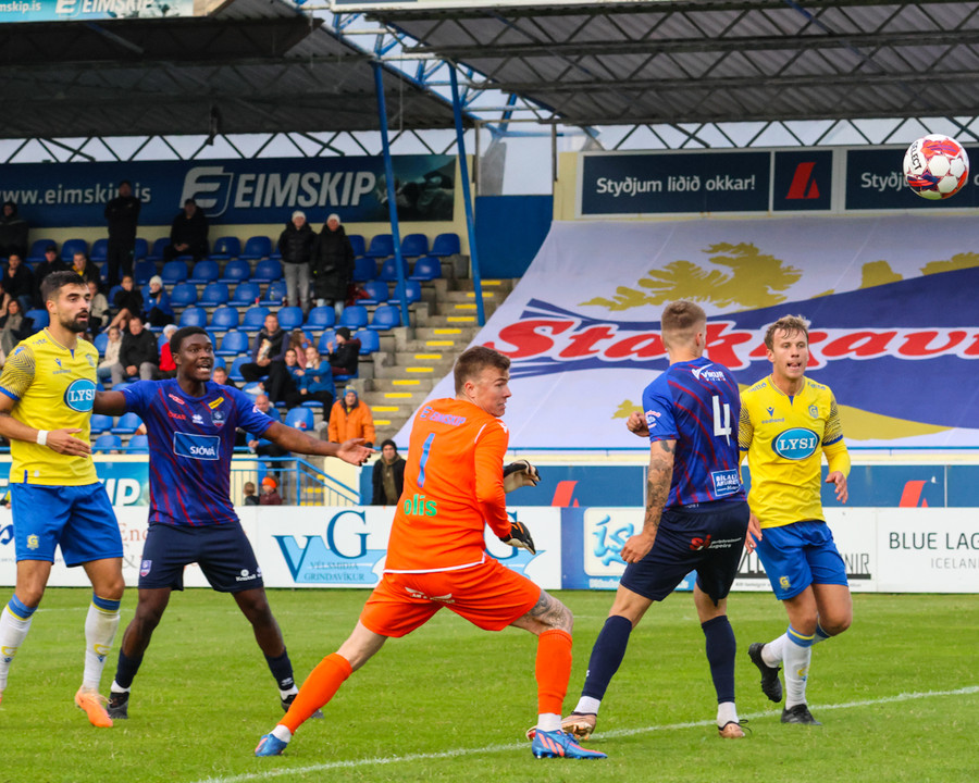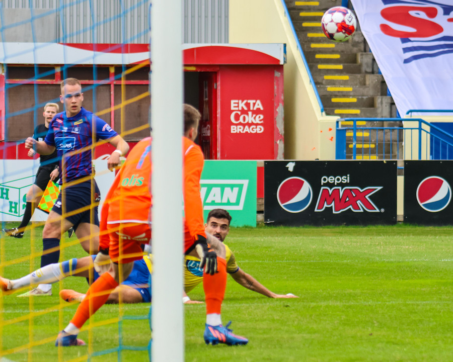 Grindvíkingar vinna boltann hátt á vellinum. Tómas Orri hikar ekkert og lætur bara vaða af löngu færi. Viktor ögn framarlega í markinu og missir boltann yfir sig sem smellur í slánni og út.