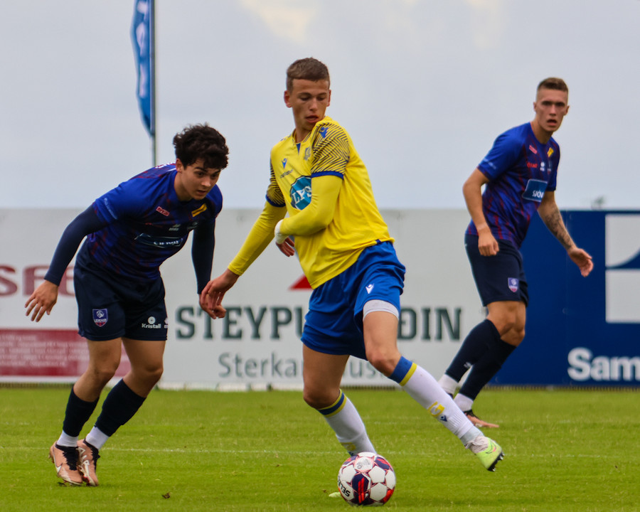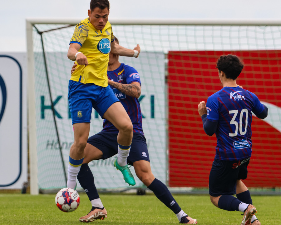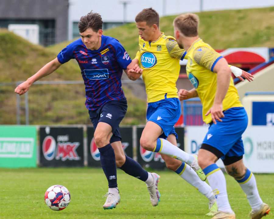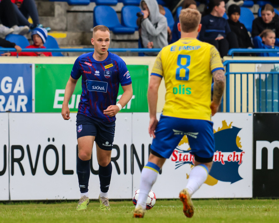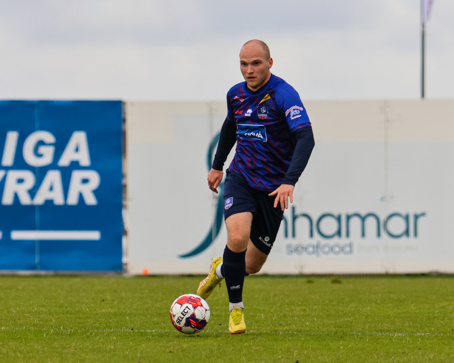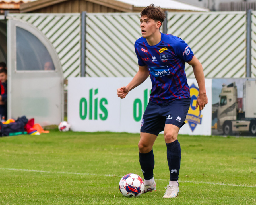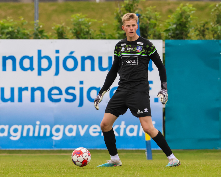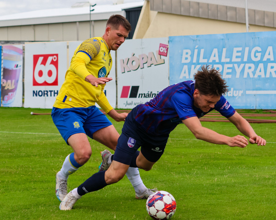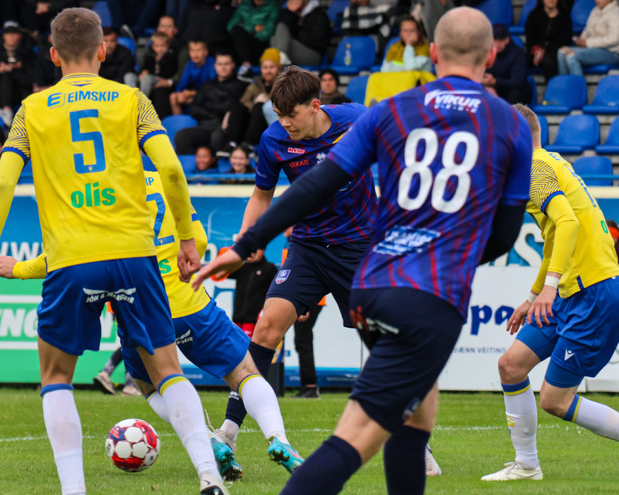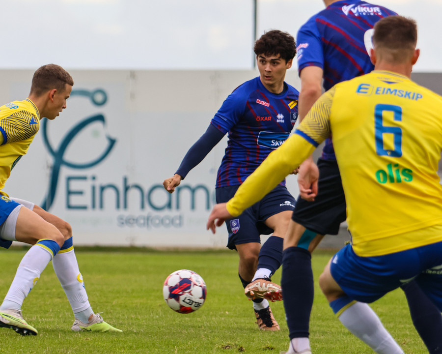 Dagur Ingi gerir vel í að taka boltann niður eftir langan bolta fram. Finnur Símon Loga við D-bogann sem lætur vaða en boltann framhjá markinu.