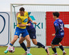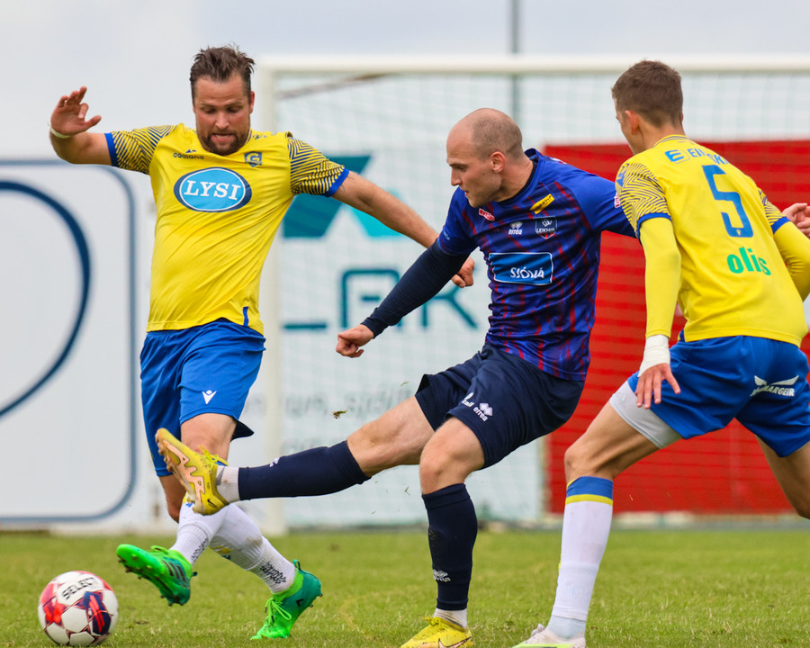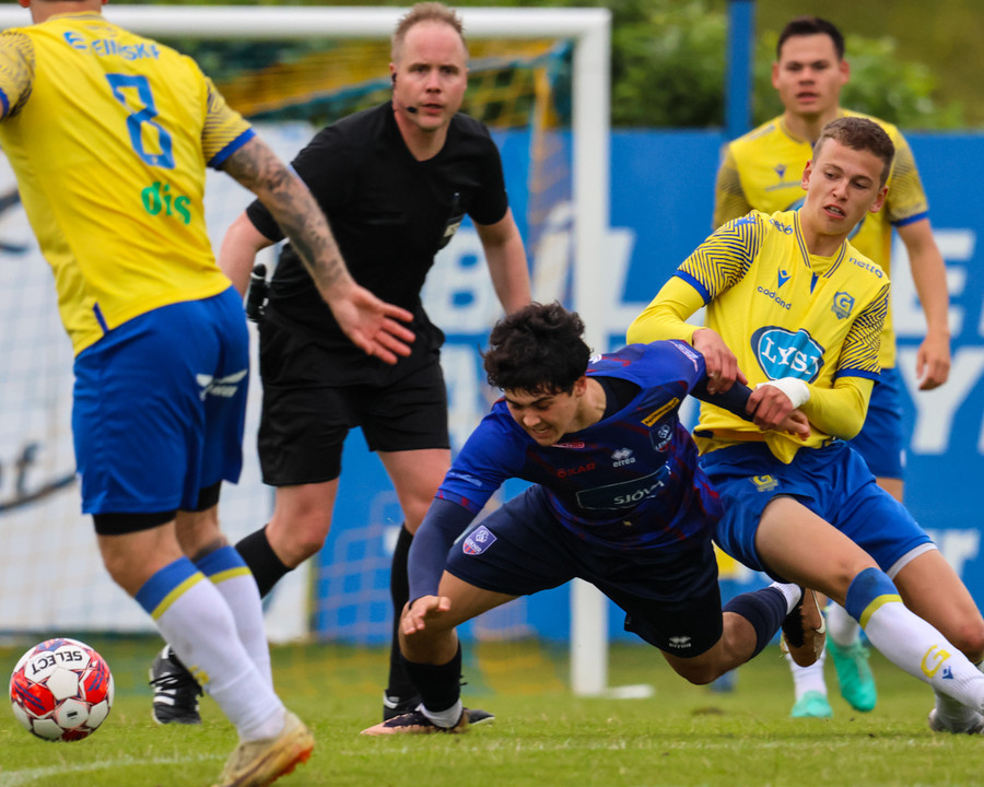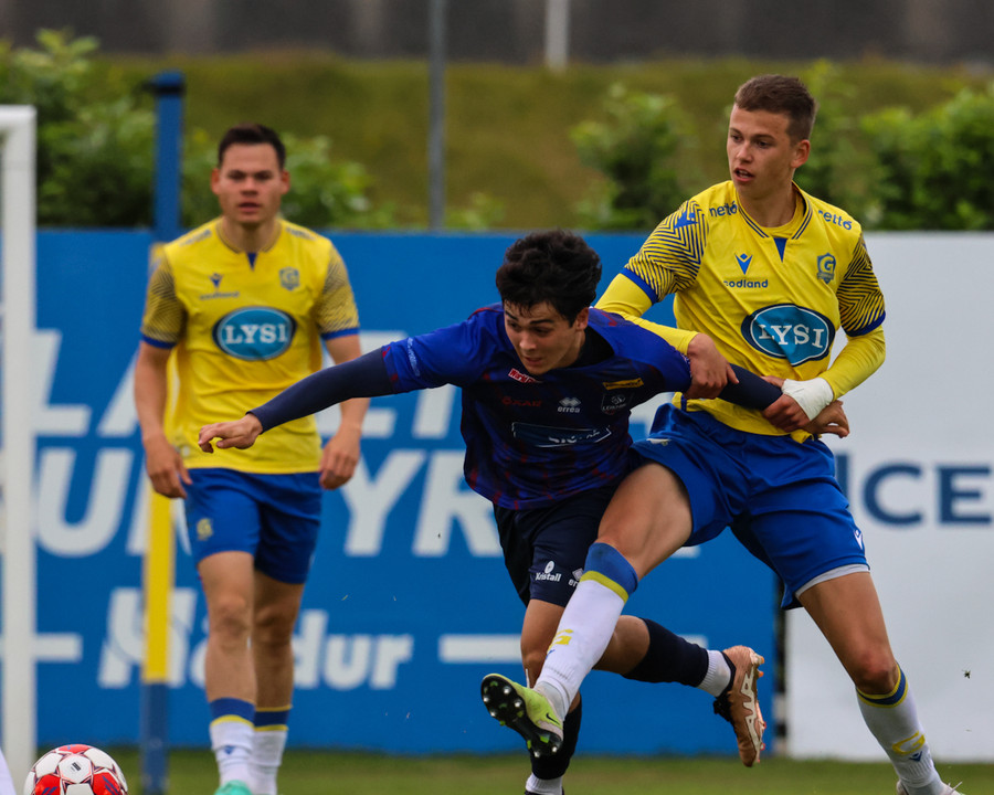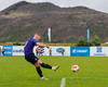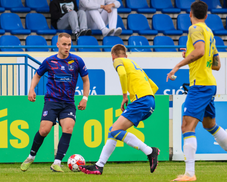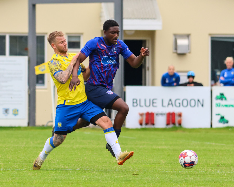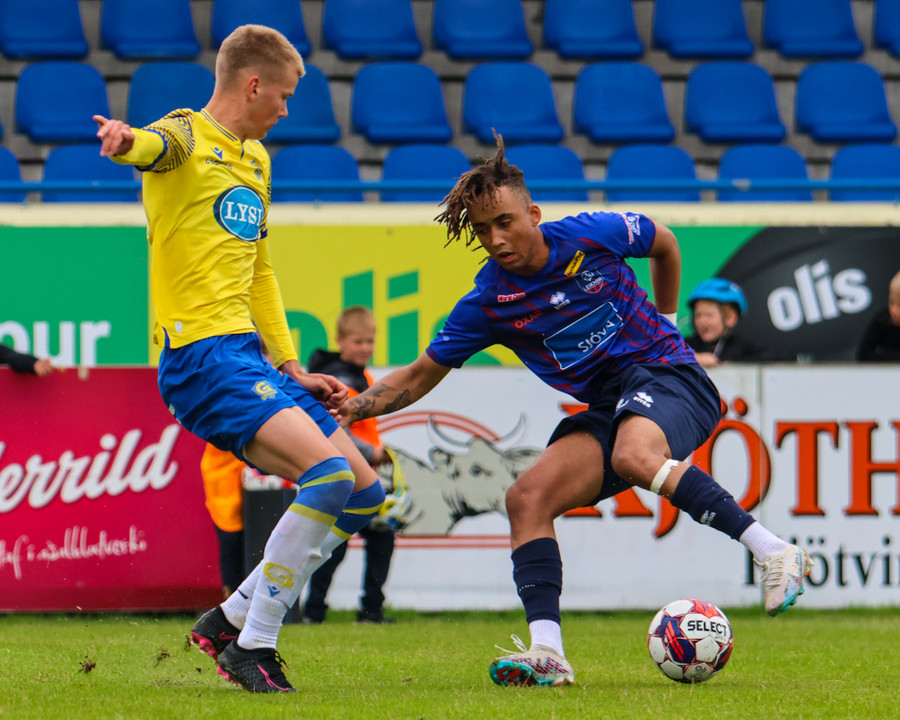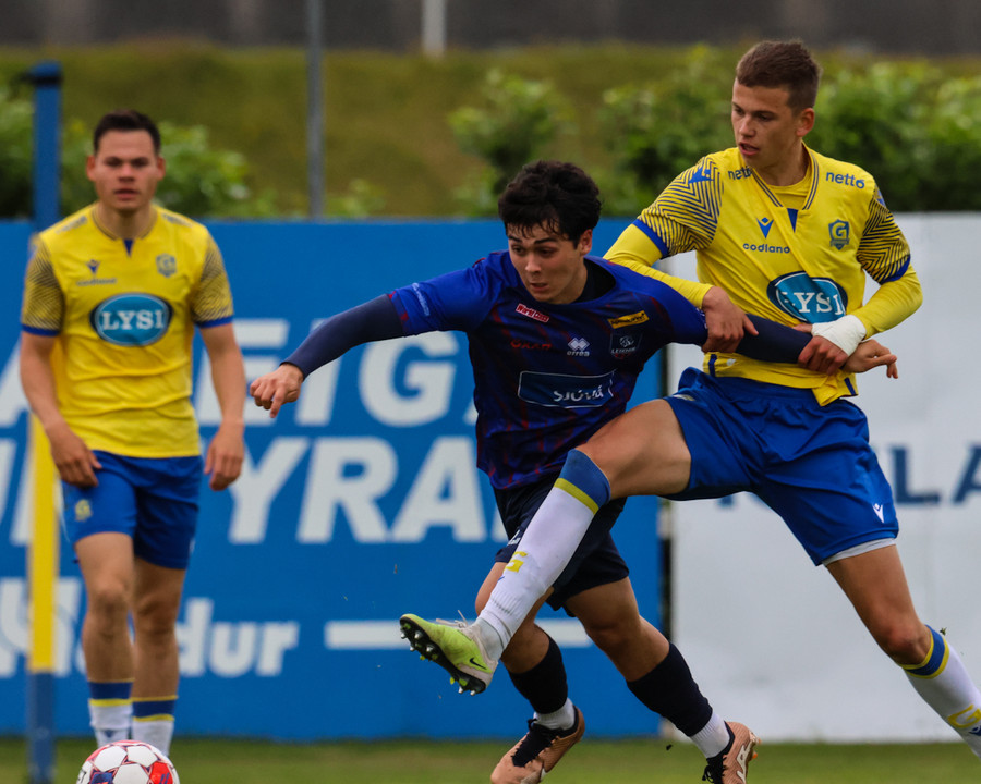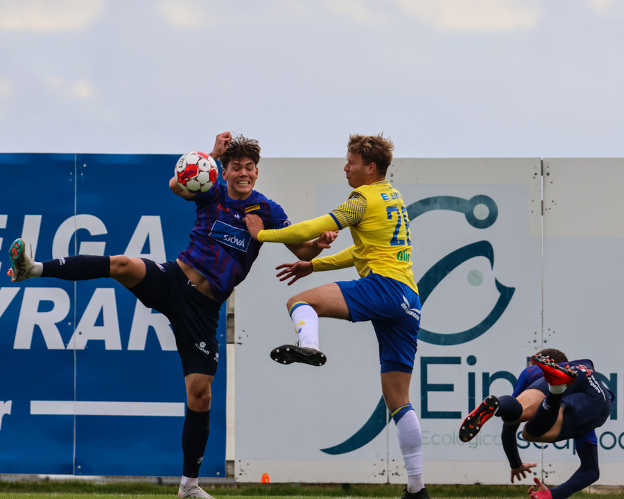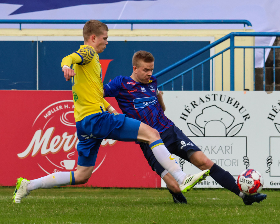 Dagur Ingi gerir vel í að taka boltann niður eftir langan bolta fram. Finnur Símon Loga við D-bogann sem lætur vaða en boltann framhjá markinu.