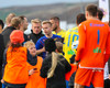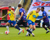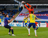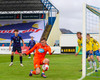 Nær lúmsku skoti með grasinu sem að rúllar rétt framhjá stönginni fjær.