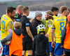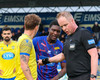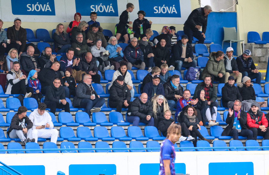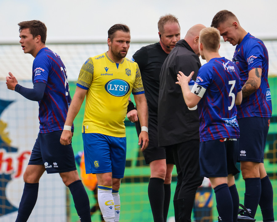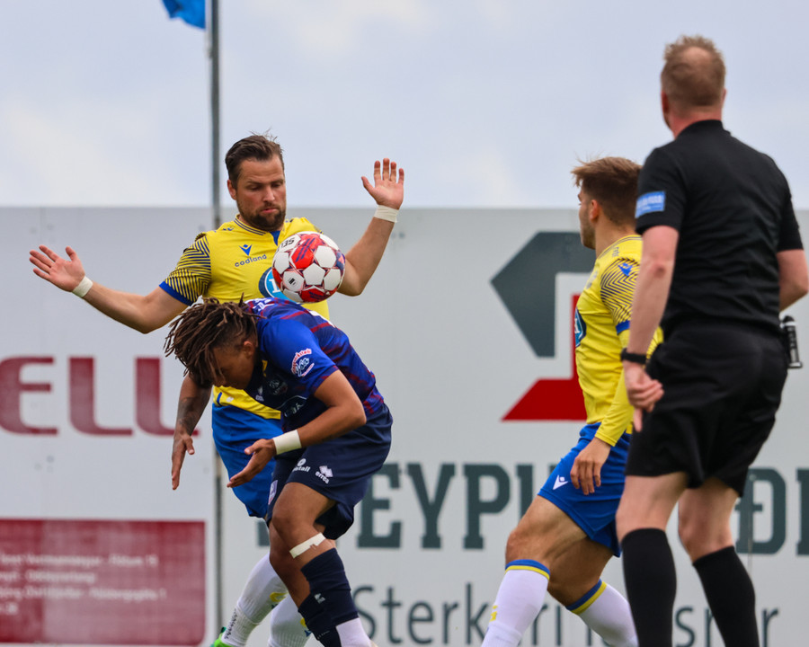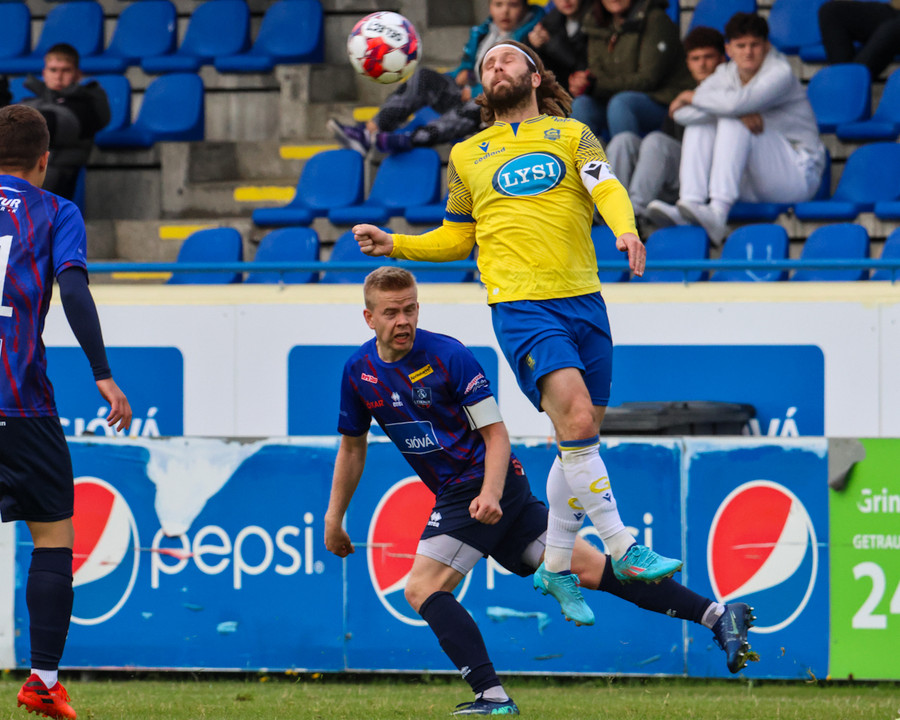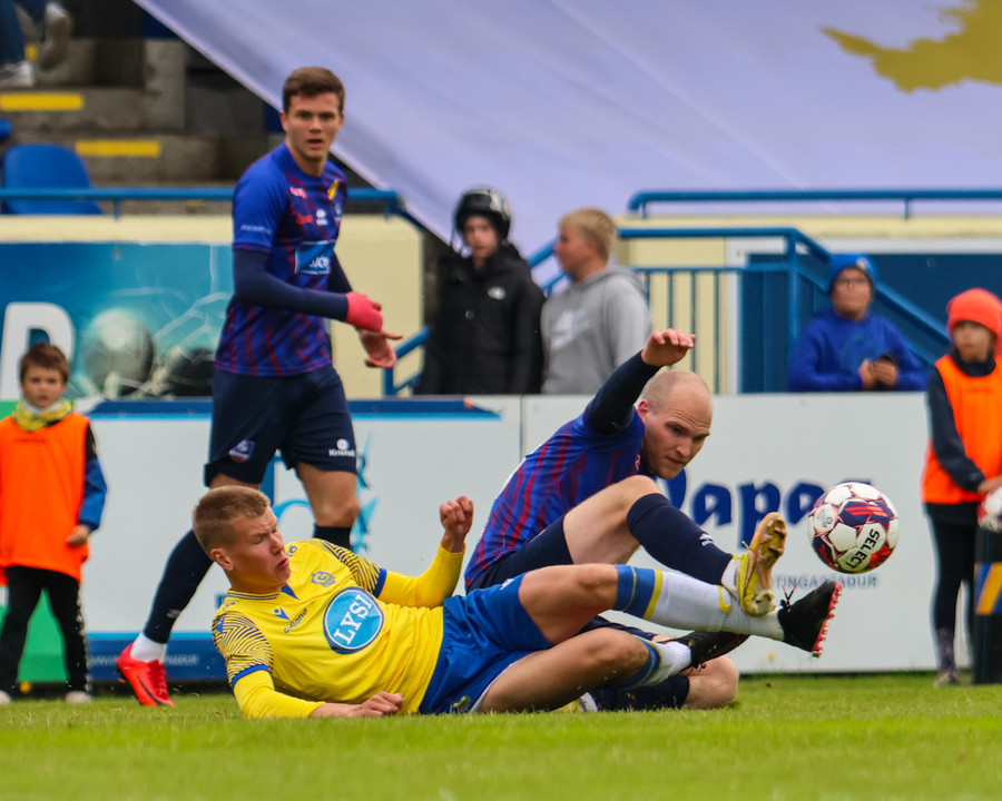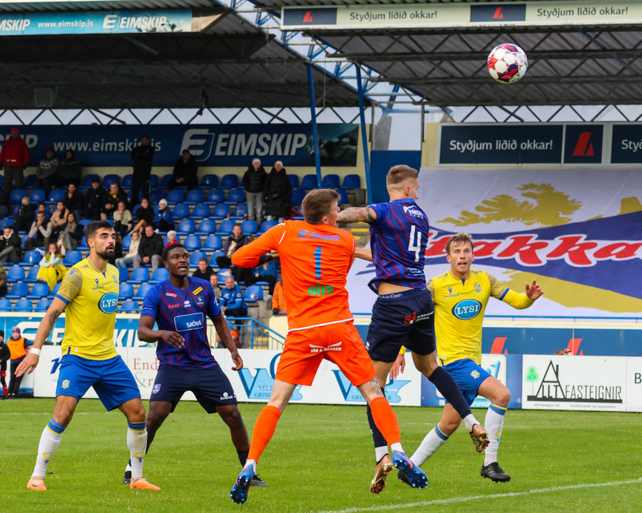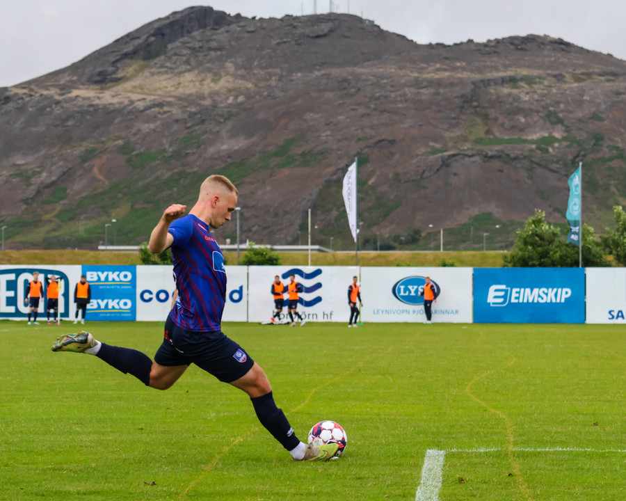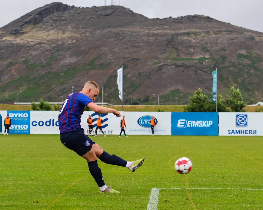 Leiknismenn henda öllu fram. Langur bolti fram á Omar sem skallar hann niður á Veseli en flaggið á loft.