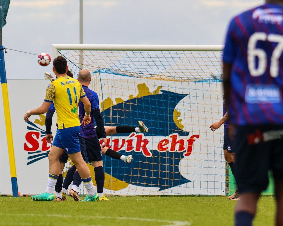 Ólafur Flóki með fyrirgjöf sem Guðjón Pétur skallar framhjá markinu.