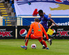 Sleppur einn í gegn og ég hreinlega veit ekki hvað hann ætlaði að gera. Hafði alla möguleika á að skjóta bara einn gegn Aroni en tekur boltann með sér og reynir að fara framhjá honum. Aron nær til boltans og ekkert verður úr.