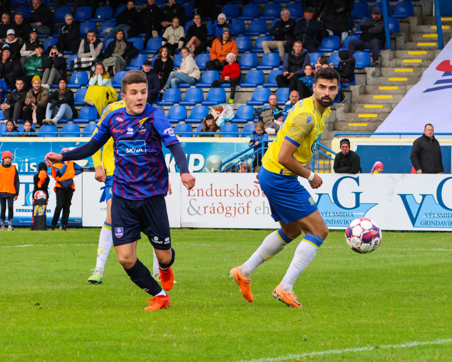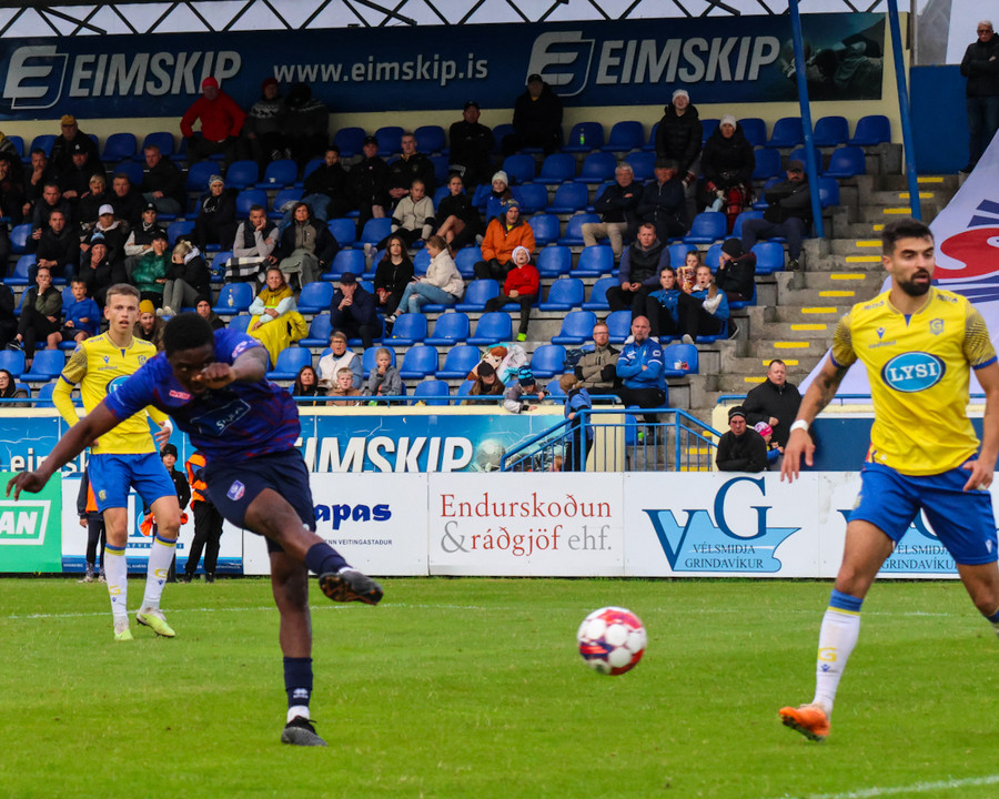 Grindvíkingar vinna botlann strax og keyra upp, Dagur Ingi með fyrirgjöf fyrir markið frá vinstri, Óskar mætir og er aleinn en skallar boltann framhjá.