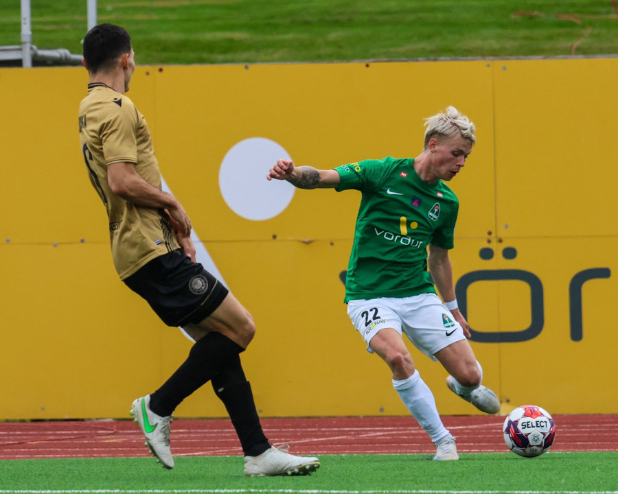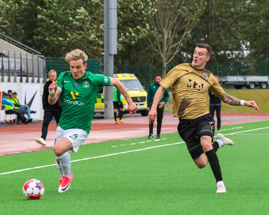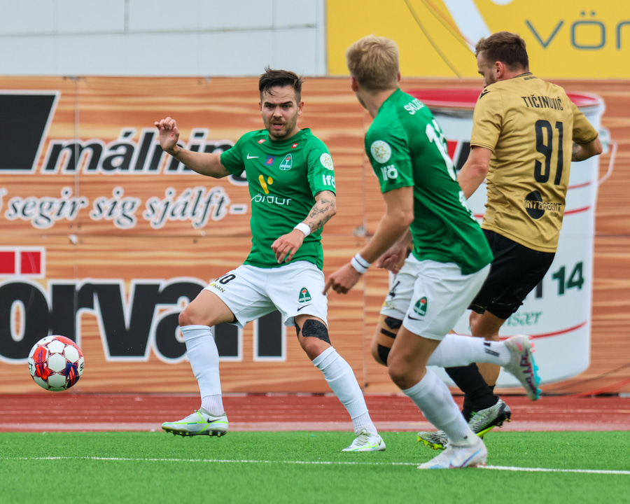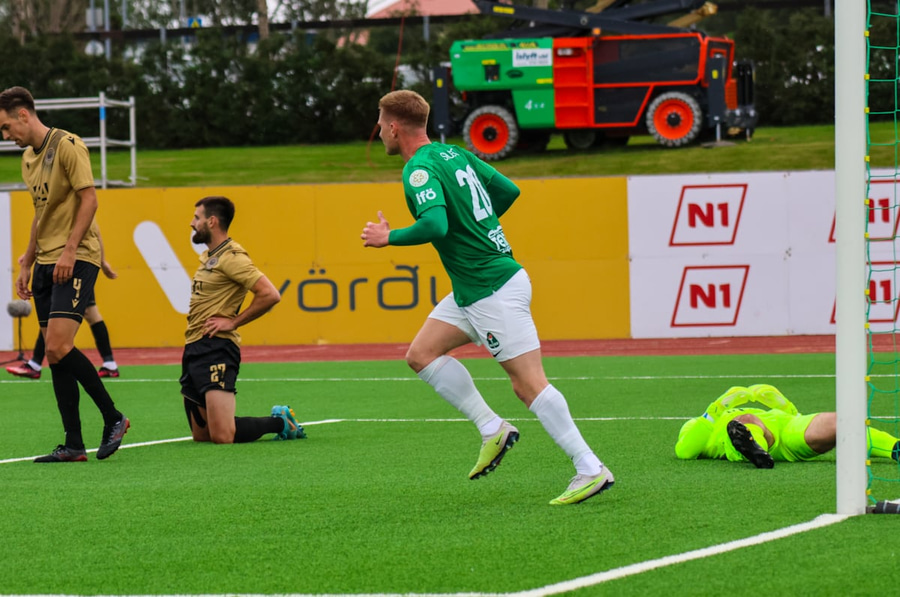 Kiddi Steindórs fær boltann úti vinstra megin og á skot í nærhornið en það er mjög lélegt og Maric í markinu á auðvelt með þetta