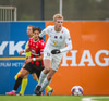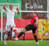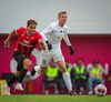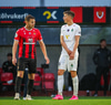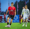 Aron Elís fær sendingu frá Nikolaj og er einn gegn Brynjari Atla en skotið yfir markið.