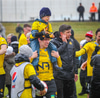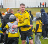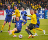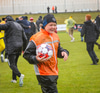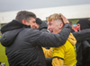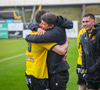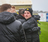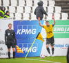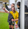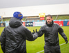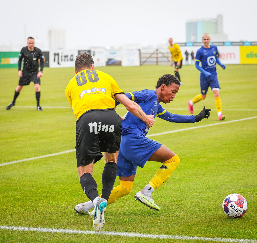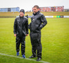 Árni Marínó fær hér aðhlynningu eftir sanmstuð við Tareq. Hann er staðinn upp og í lagi.