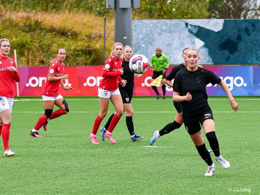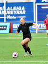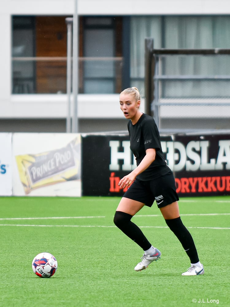 Lise Dissing með fínan sprett og reynir fyrirgjöf en hún fer af varnarmanni og í hendurnar á Aldísi.