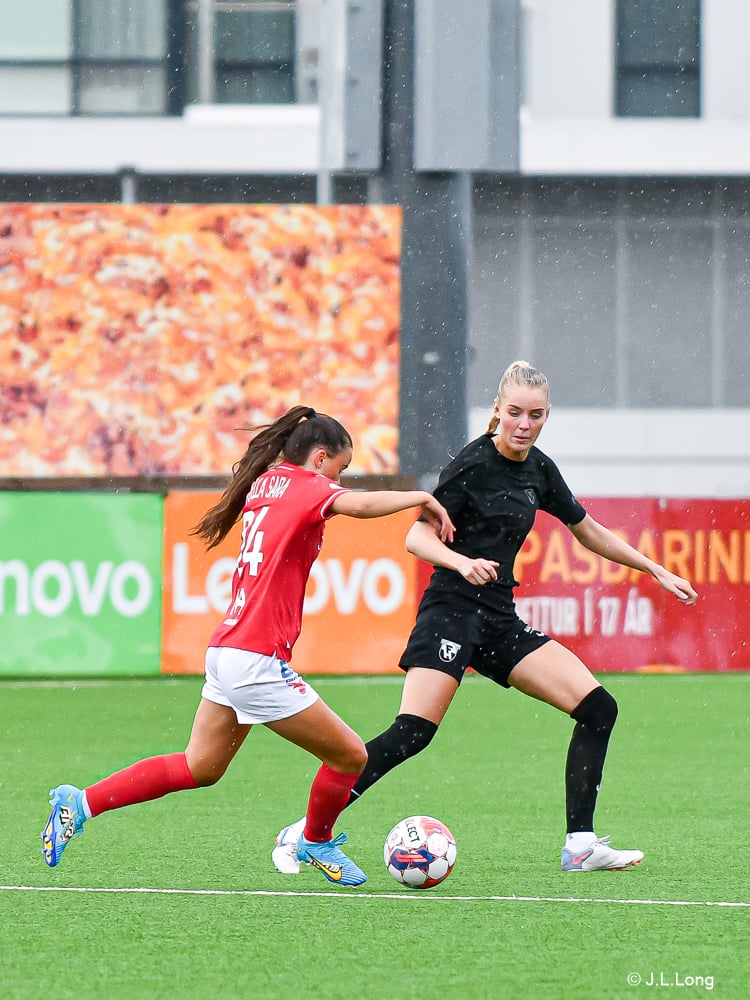 Lise Dissing við það að sleppa í gegn en Colleen Kennedy gerir frábærlega varnarlega og vinnur markspyrnu fyrir FH.