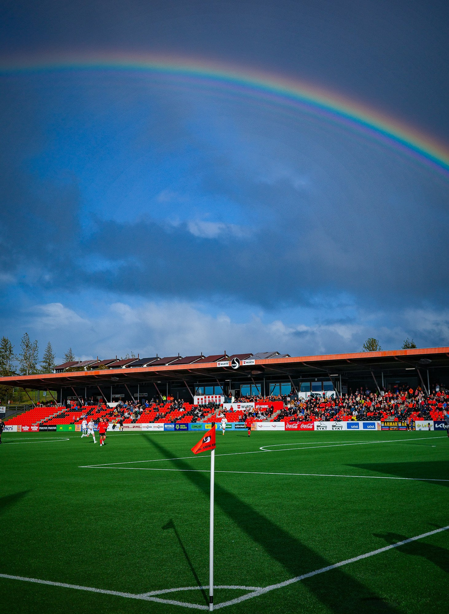 Þetta er farið af stað. ÍBV byrjar með boltann og sækja í átt að Árbæjarlaug.