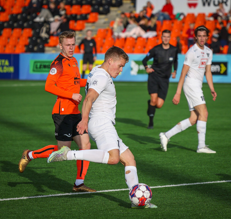 Sveinn Gísli með skemmtilega takta hér á fyrstu mínútum seinni hálfleiks. Tók léttan Cruyff snúning hér fyrir stuttu og átti síðan svaka öfluga tæklingu hér miðsvæðis. Búinn að koma mjög vel inn í Fylkisliðið eftir að hann kom á láni frá Víkingi.