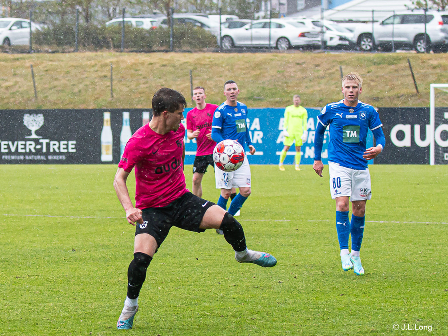 Róbert Frosti með frábæra sendingu í gegn á Emil en fyrsta snertingin sveik hann og þetta rennur í sandinn.