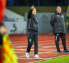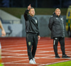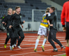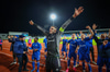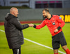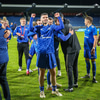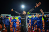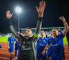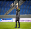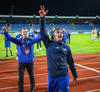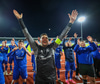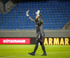 Tómas peppar stuðningsmenn þegar hann labbar af velli.