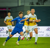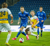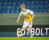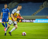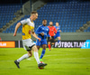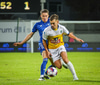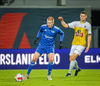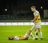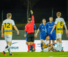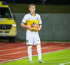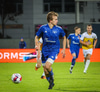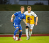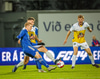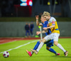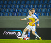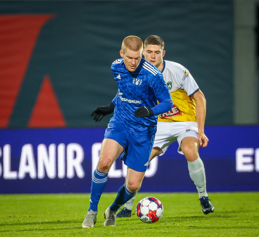 Aron brýtur á Tómasi Orra og fær réttilega gult spjald.