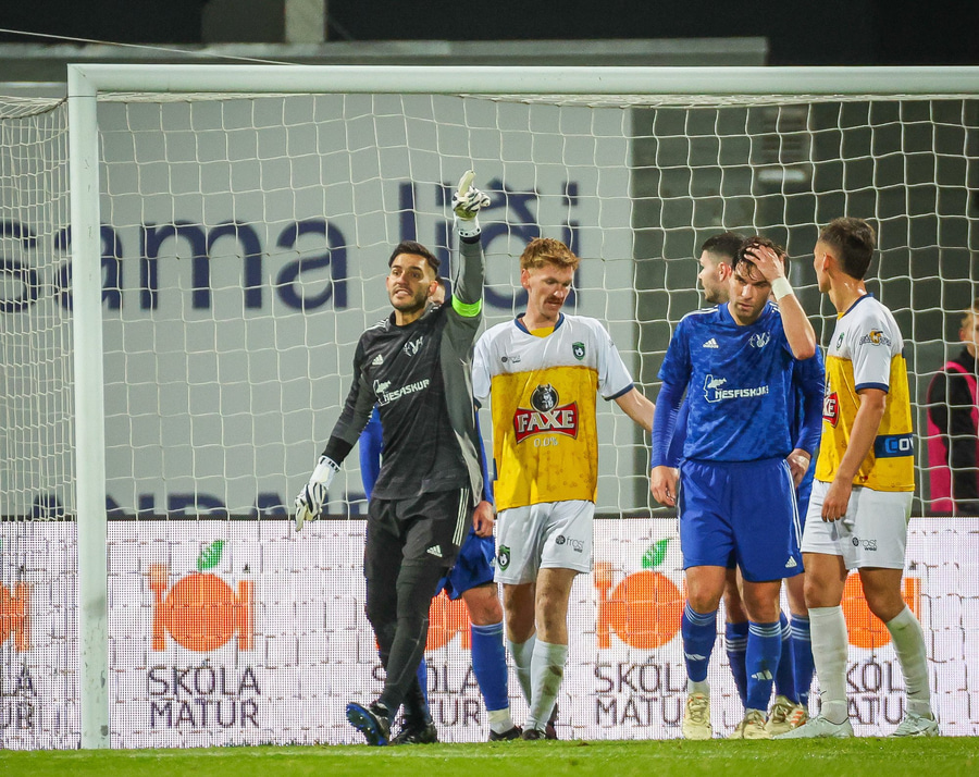 Eftir frábært samspil Jón Arnars og Birgis Ólafs berst boltinn á Ólaf Bjarna sem reynir að skrúfa boltann í fjærstöng líkt og í markinu en boltinn fer hátt yfir mark Víðis.