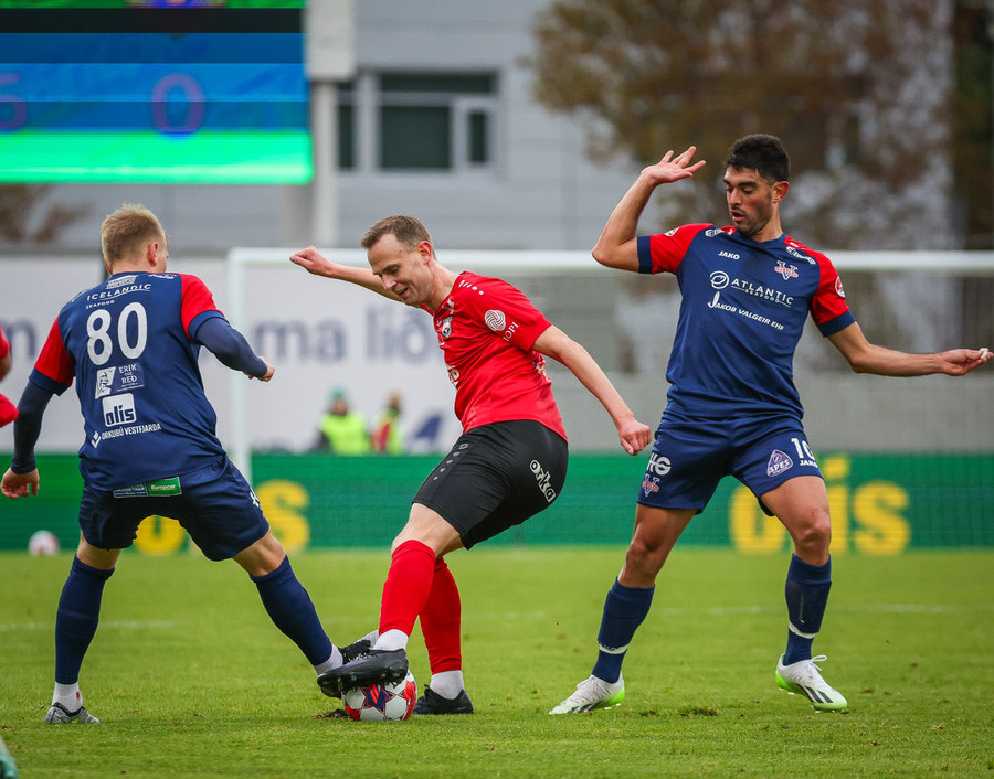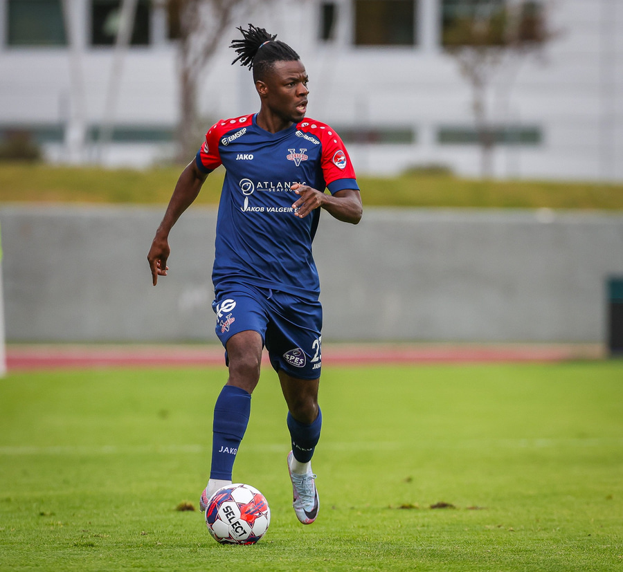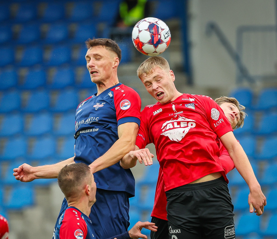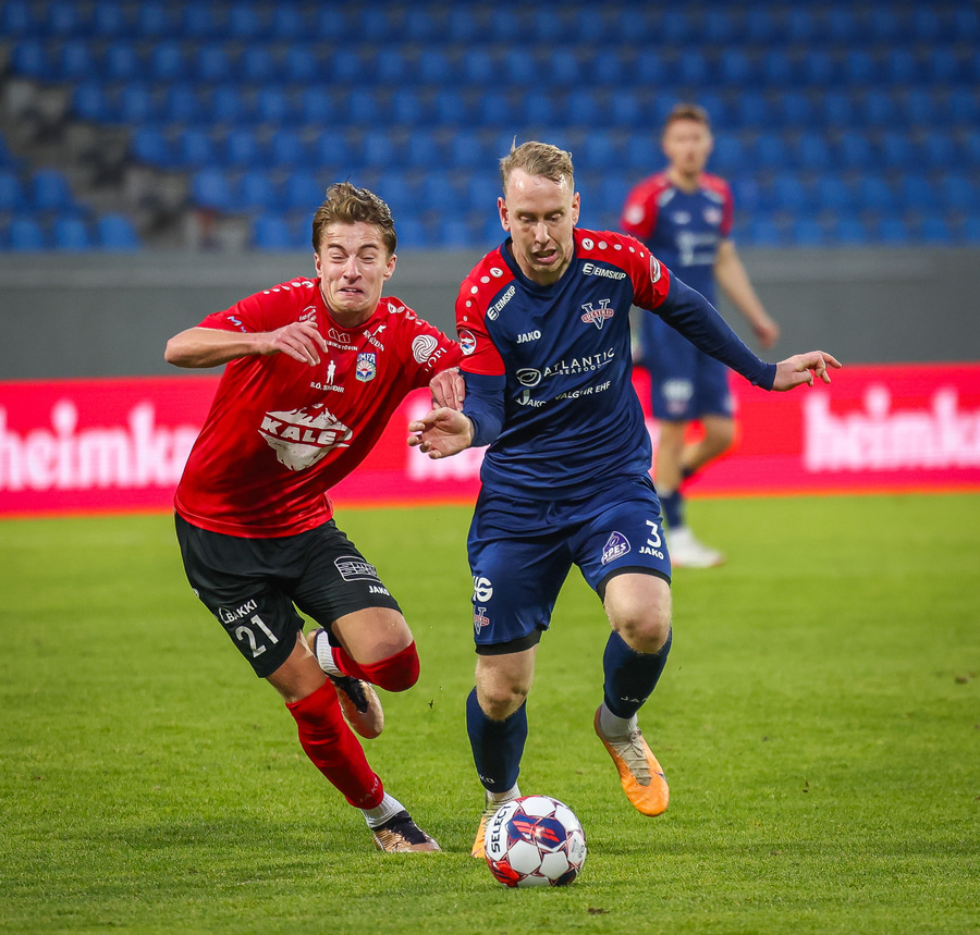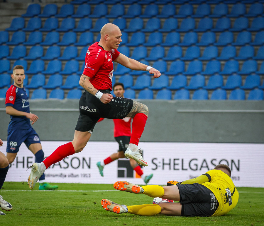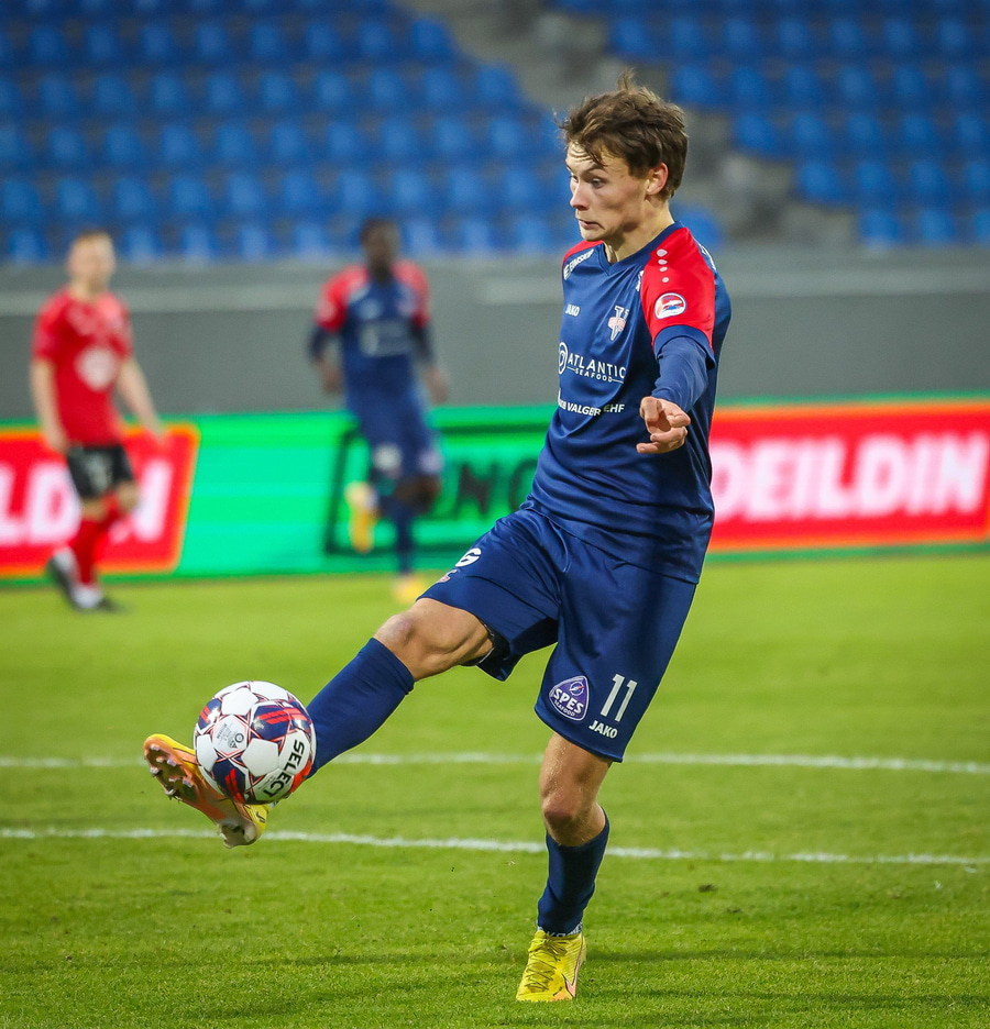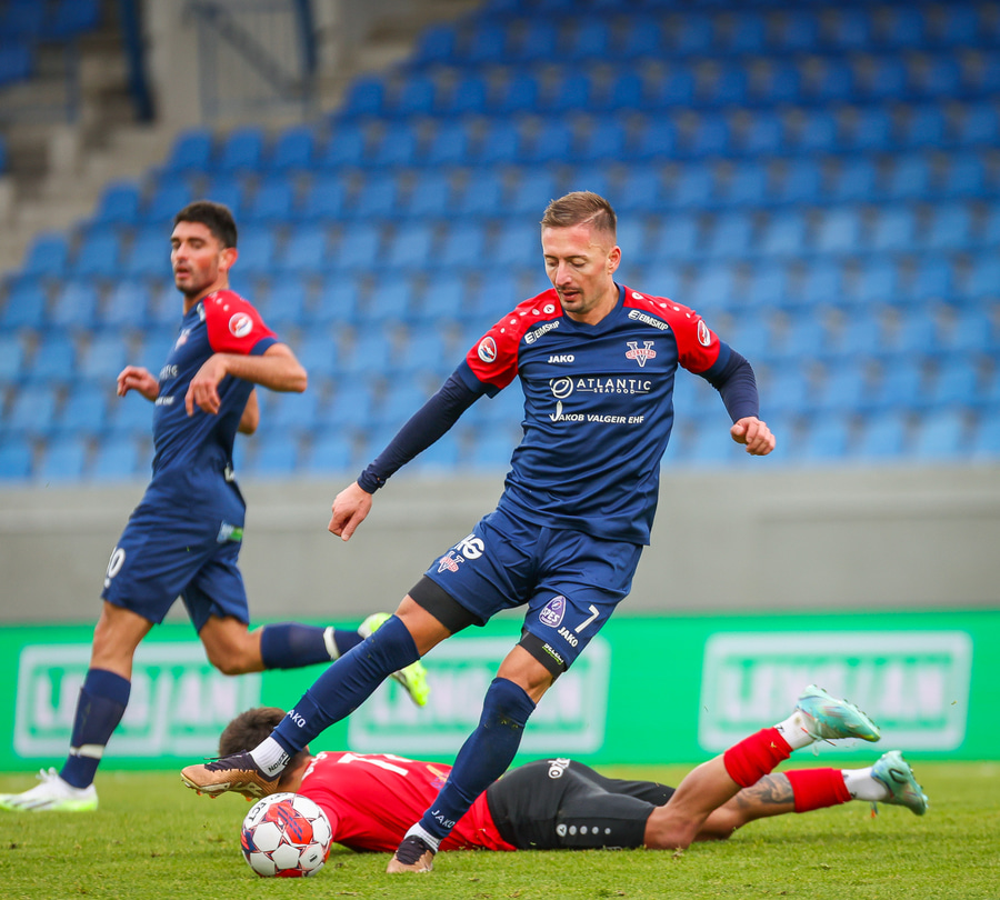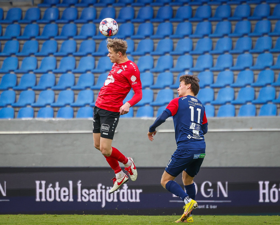 Sending inn á teig á Mikkel Jakobsen sem stígur fyrir Gunnar Bergmann og bíður eftir snertingu og fer svo niður