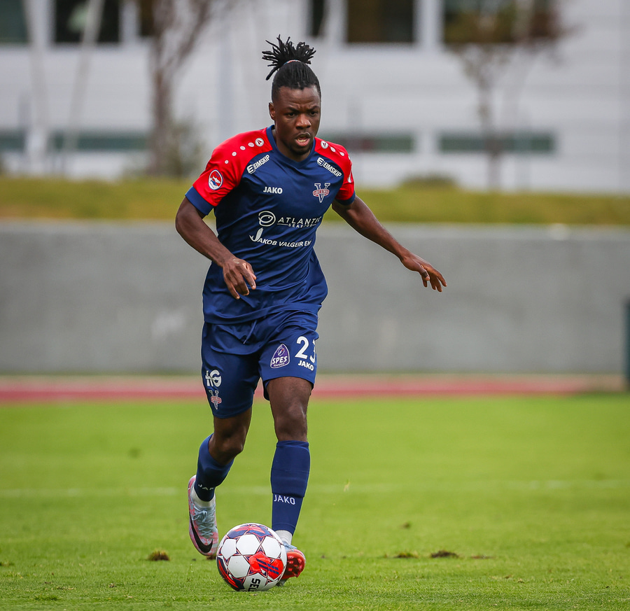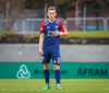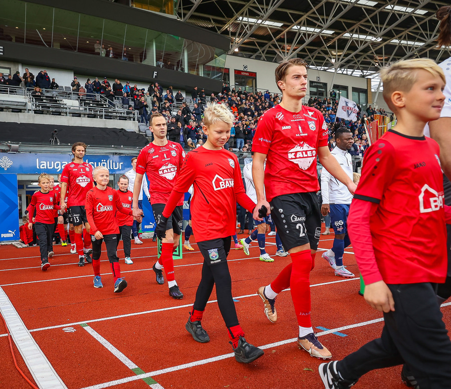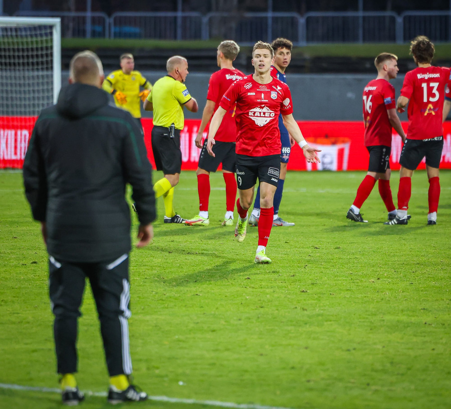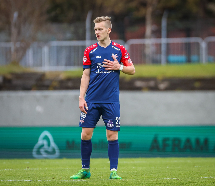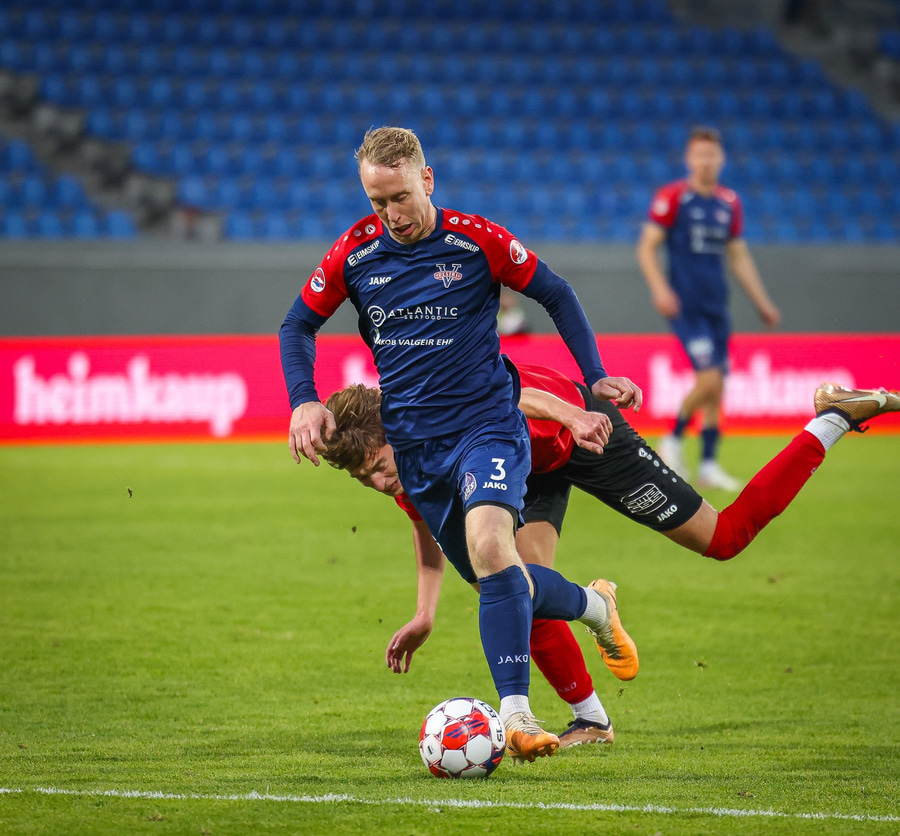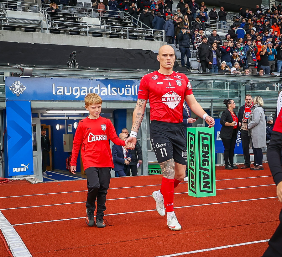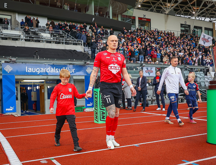 Sending inn á teig á Mikkel Jakobsen sem stígur fyrir Gunnar Bergmann og bíður eftir snertingu og fer svo niður