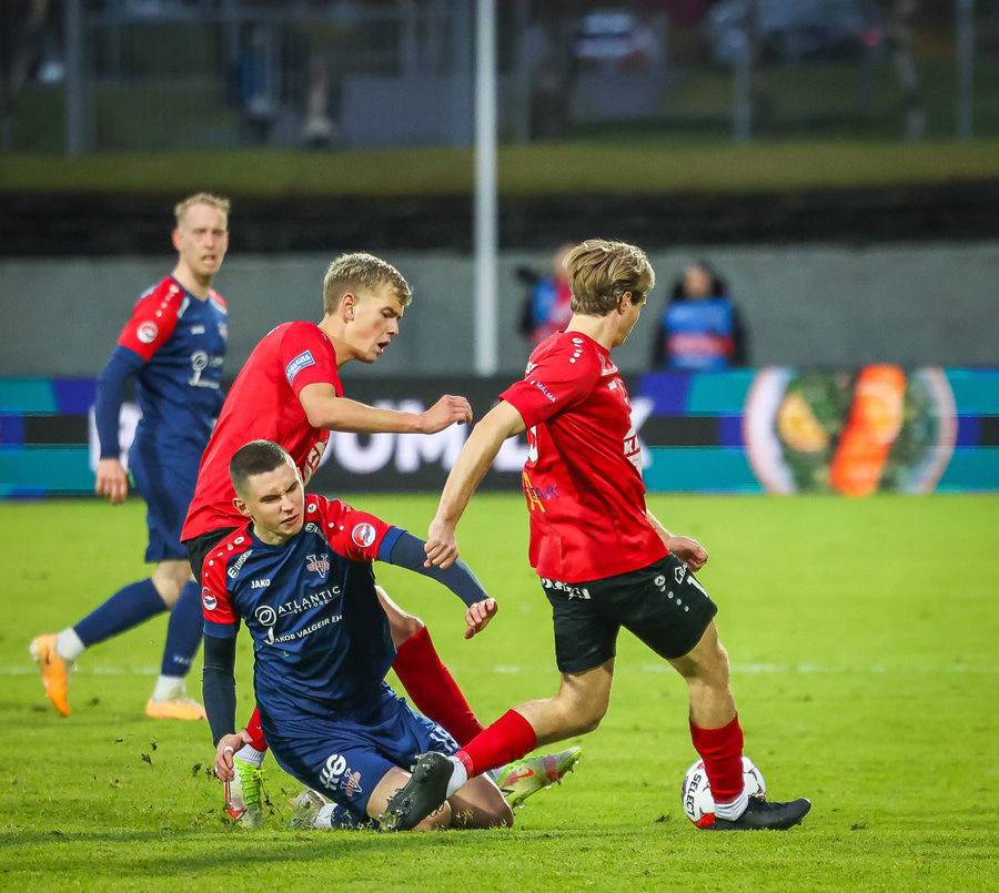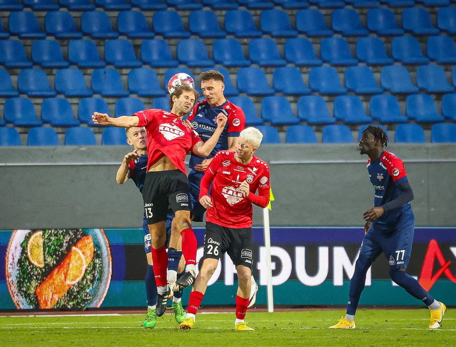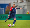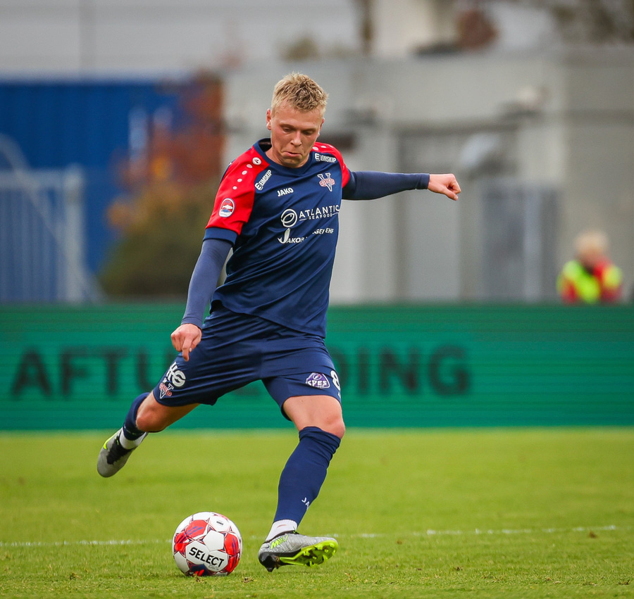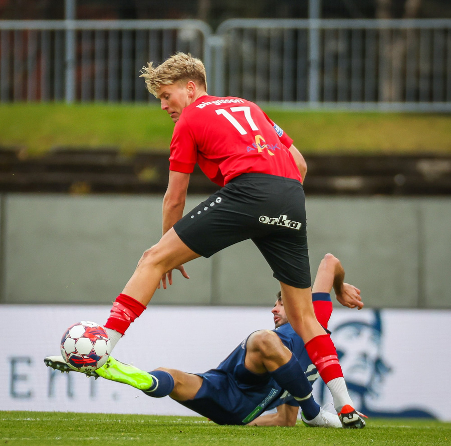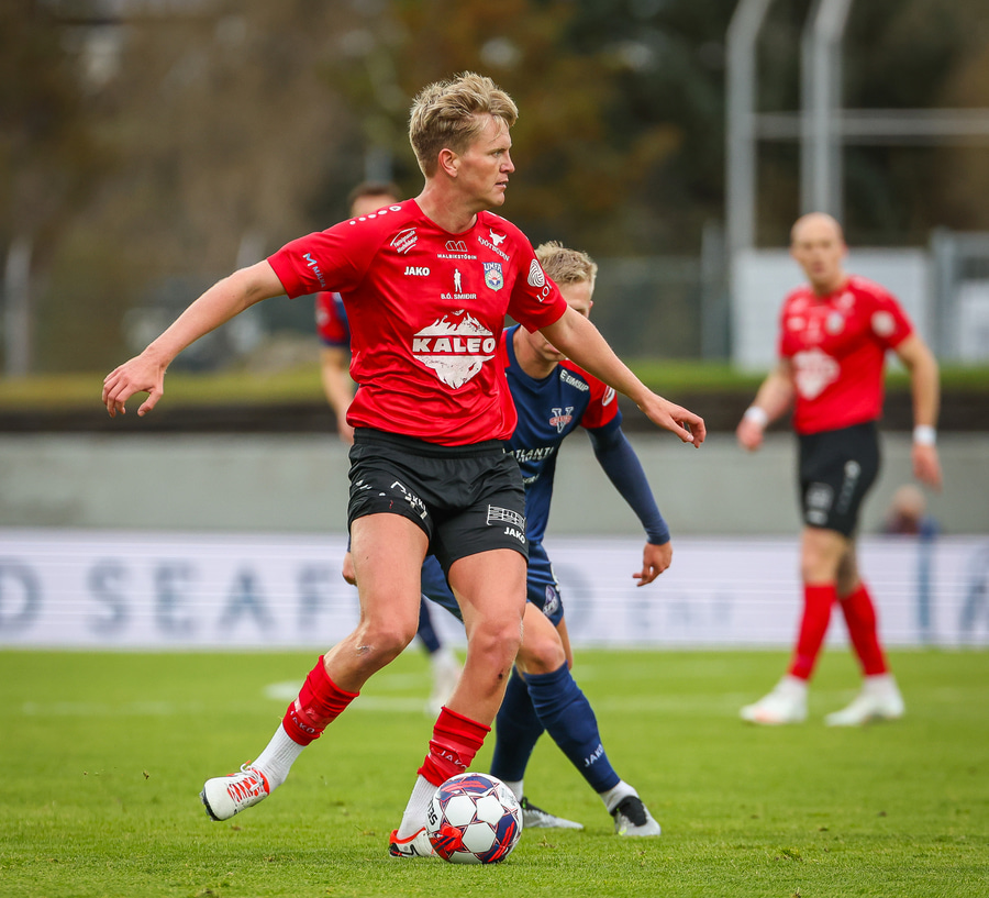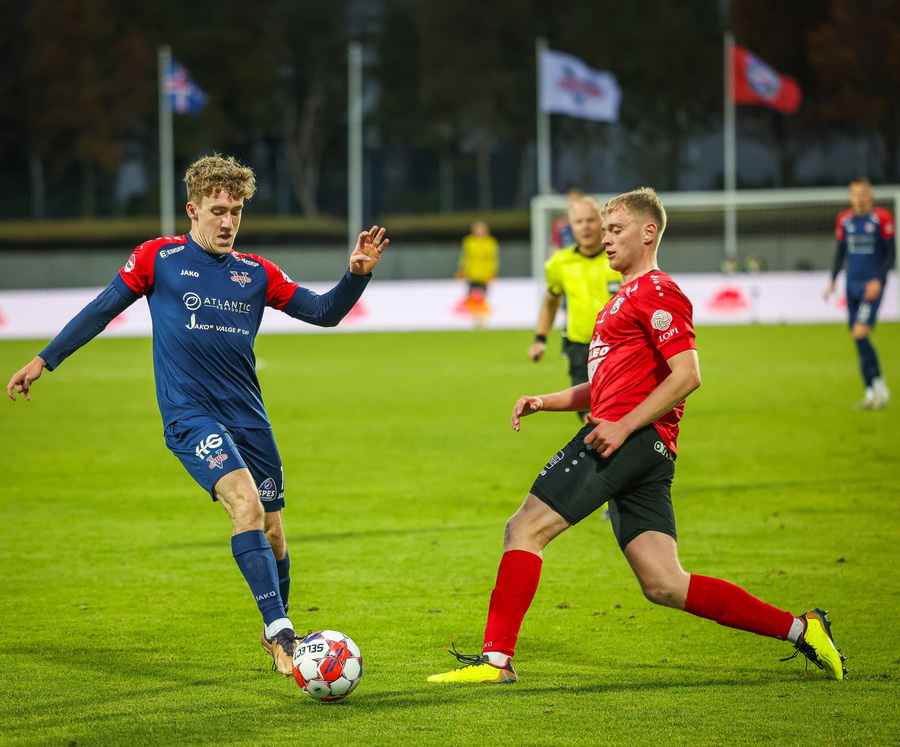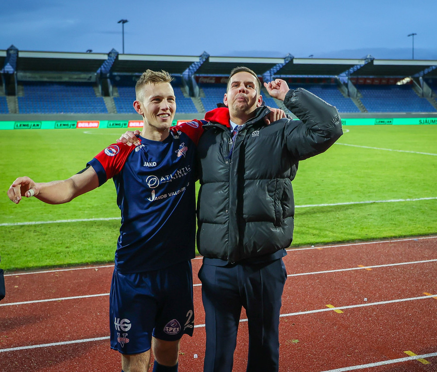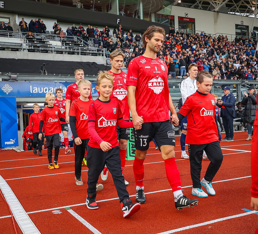 Sending inn á teig á Mikkel Jakobsen sem stígur fyrir Gunnar Bergmann og bíður eftir snertingu og fer svo niður
