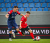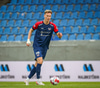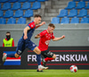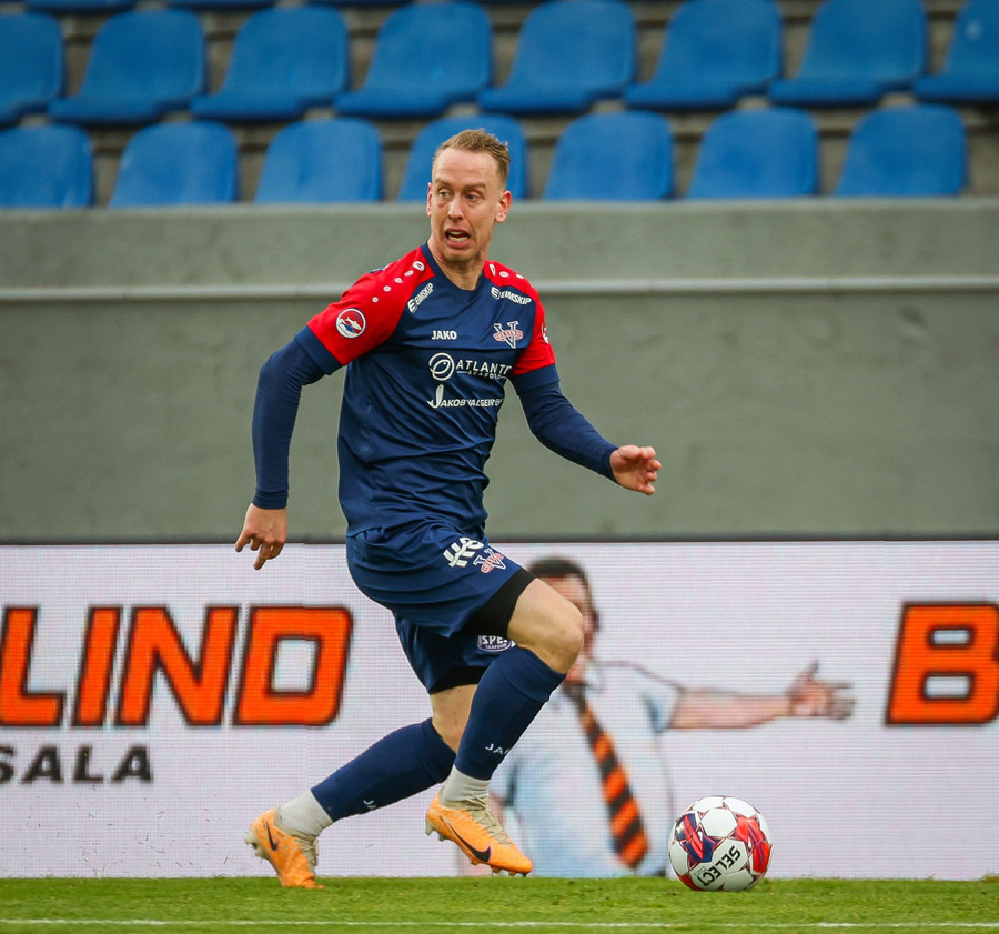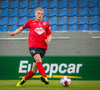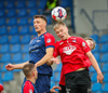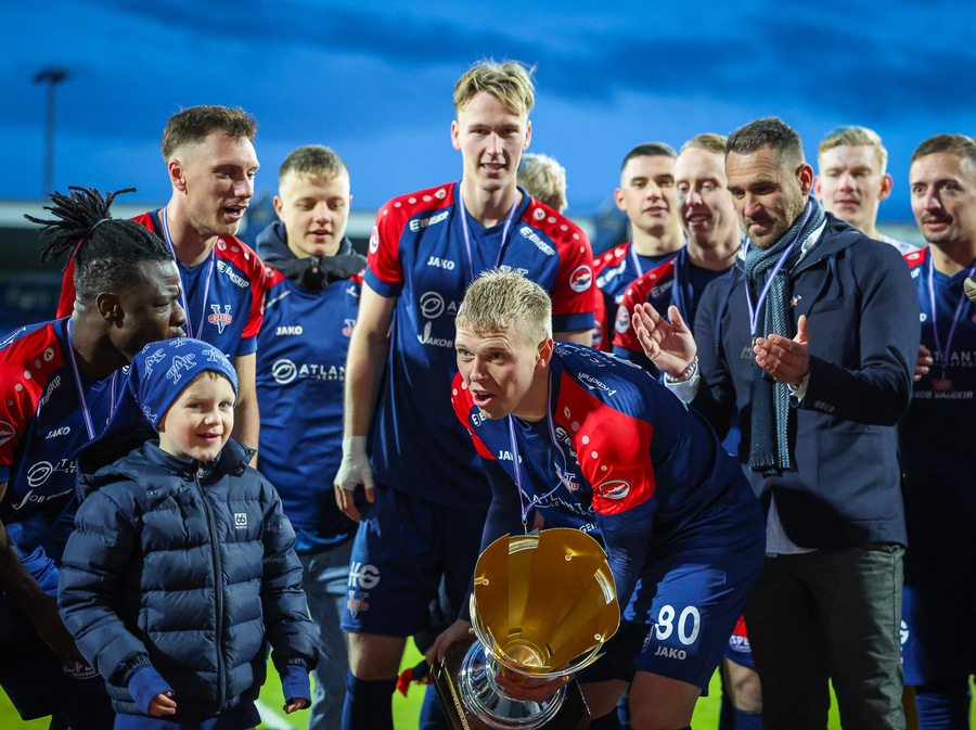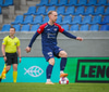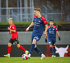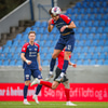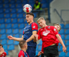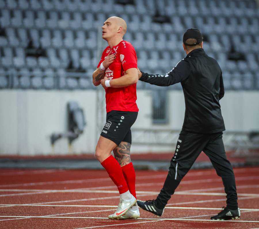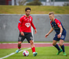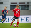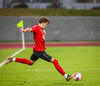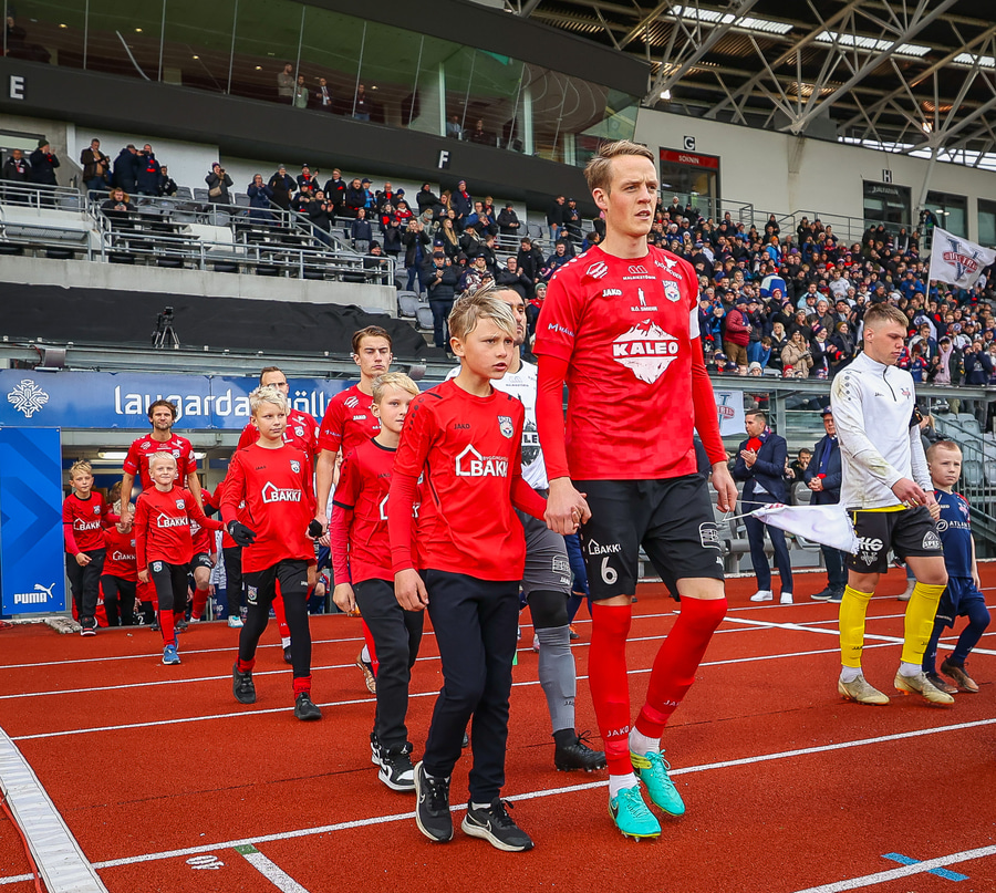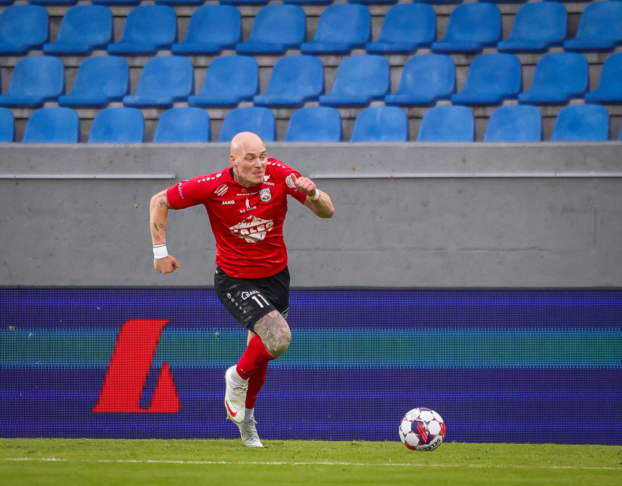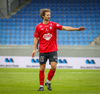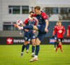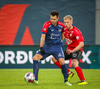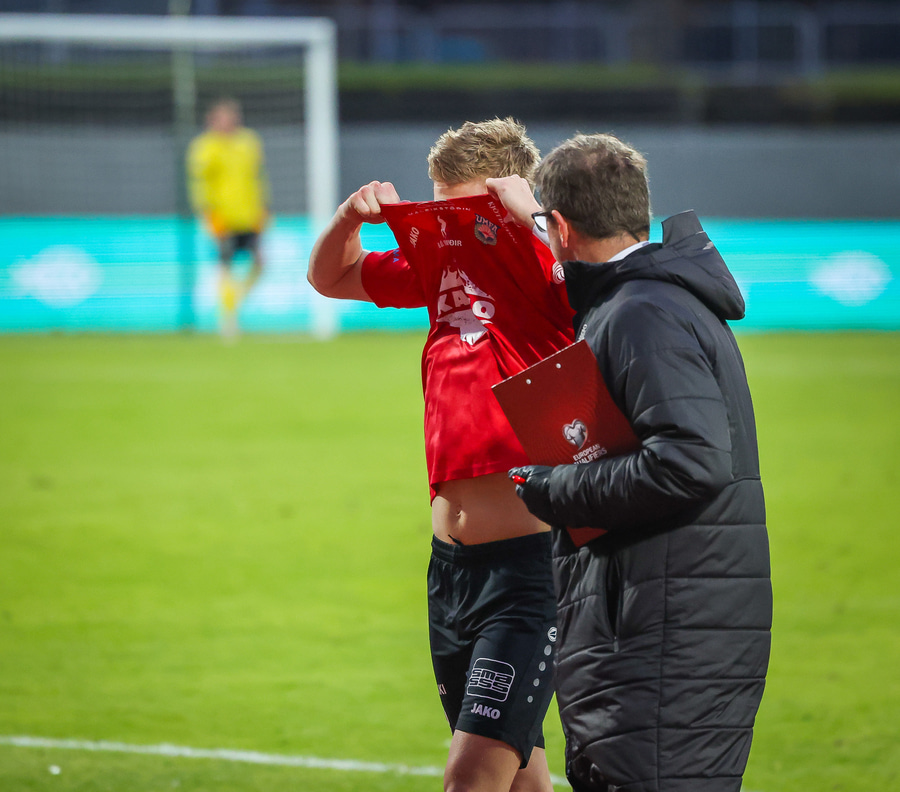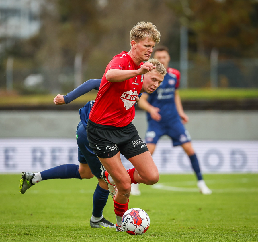Sending inn á teig á Mikkel Jakobsen sem stígur fyrir Gunnar Bergmann og bíður eftir snertingu og fer svo niður