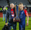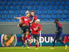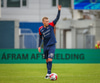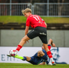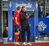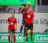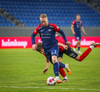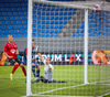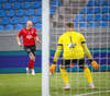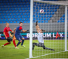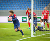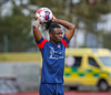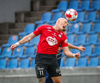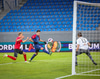 Löööng og há sending inn á teig, Morten Hansen nær góðum krafti í skallann en Yevgen í markinu grípur þetta auðveldlega