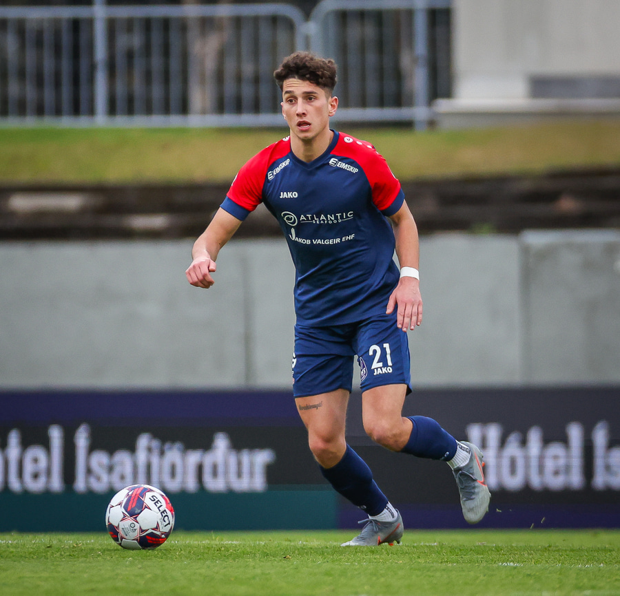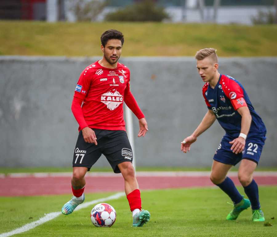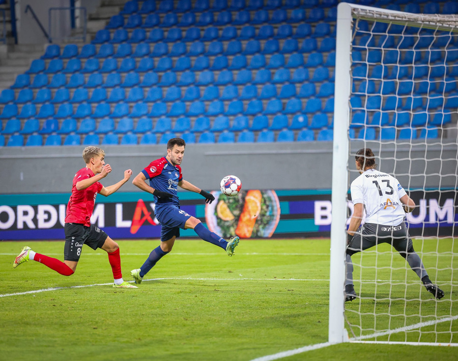 Elvar Baldvins með sendingu fyrir markið sem Iker Hernandez er svo nálægt því að koma tánni í boltann og skora