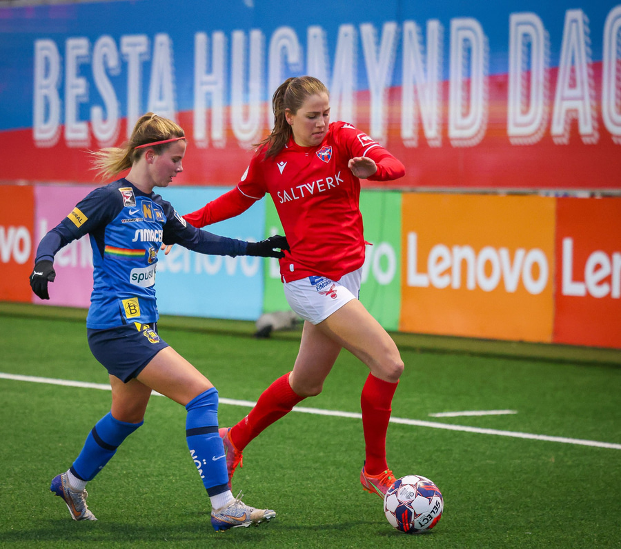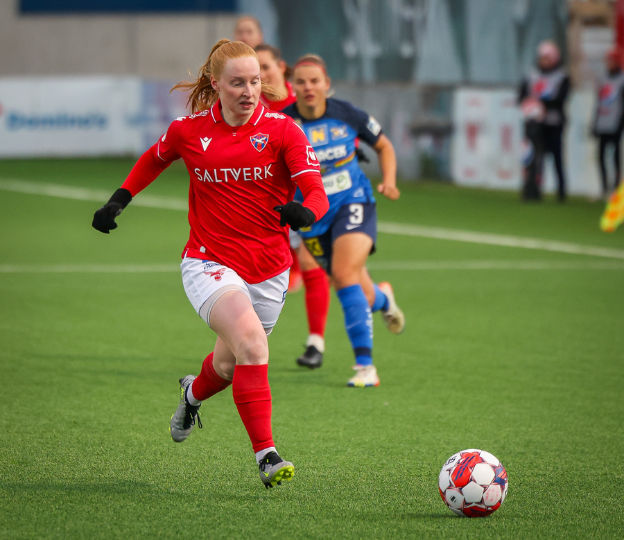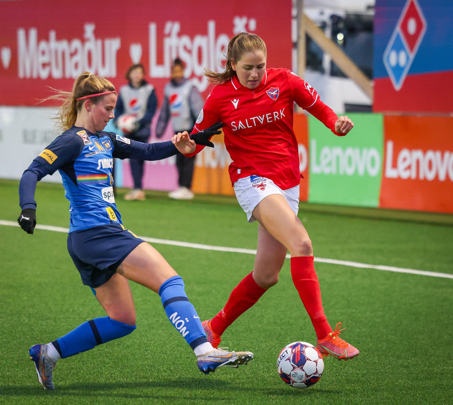 Málfríður með geggjaðan bolta inn fyrir en Jennifer Klein rétt nær til boltans áður en hann ratar í hættusvæðið.