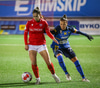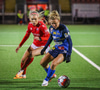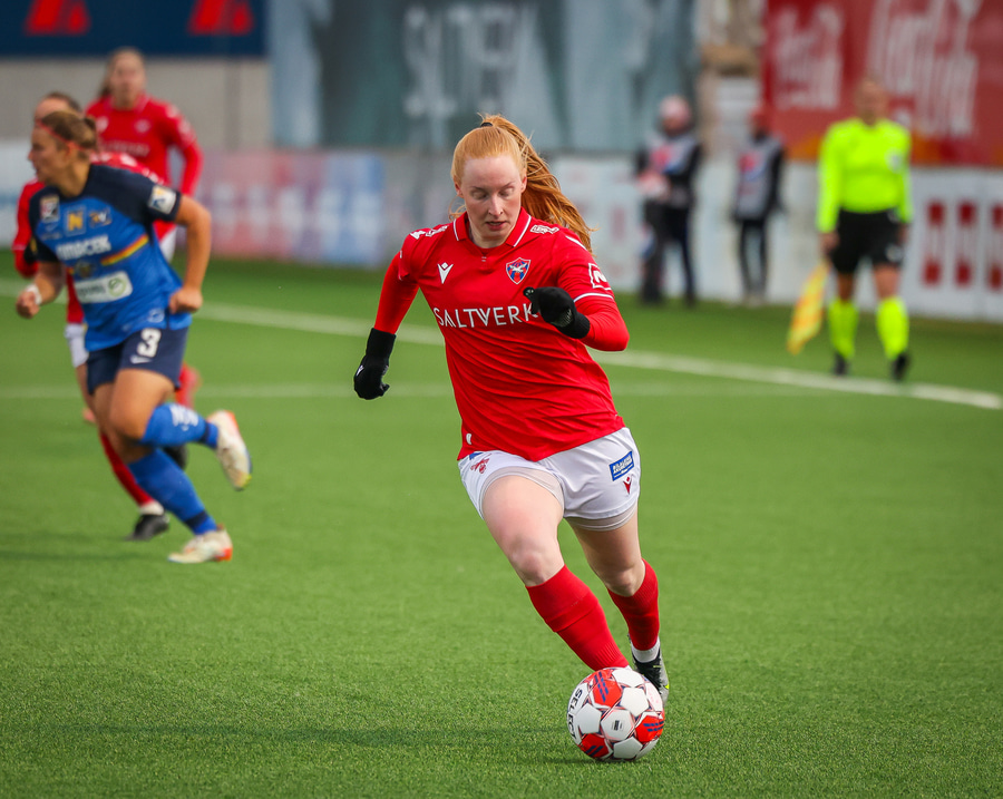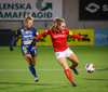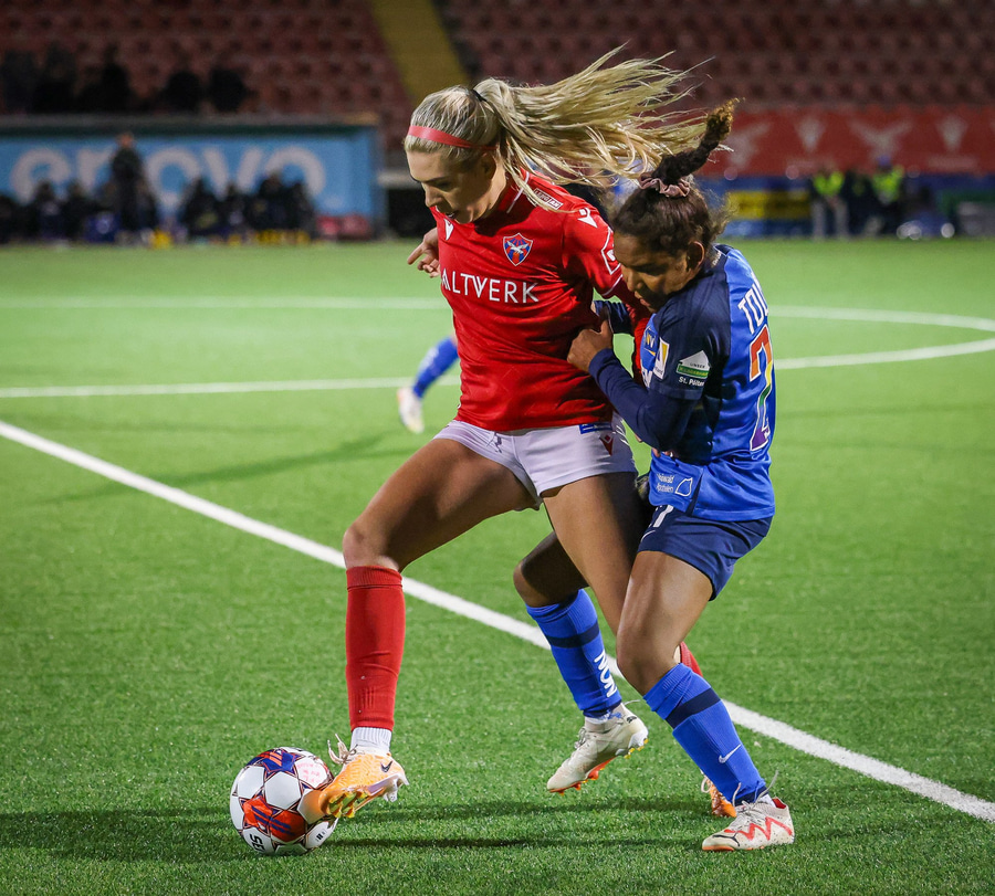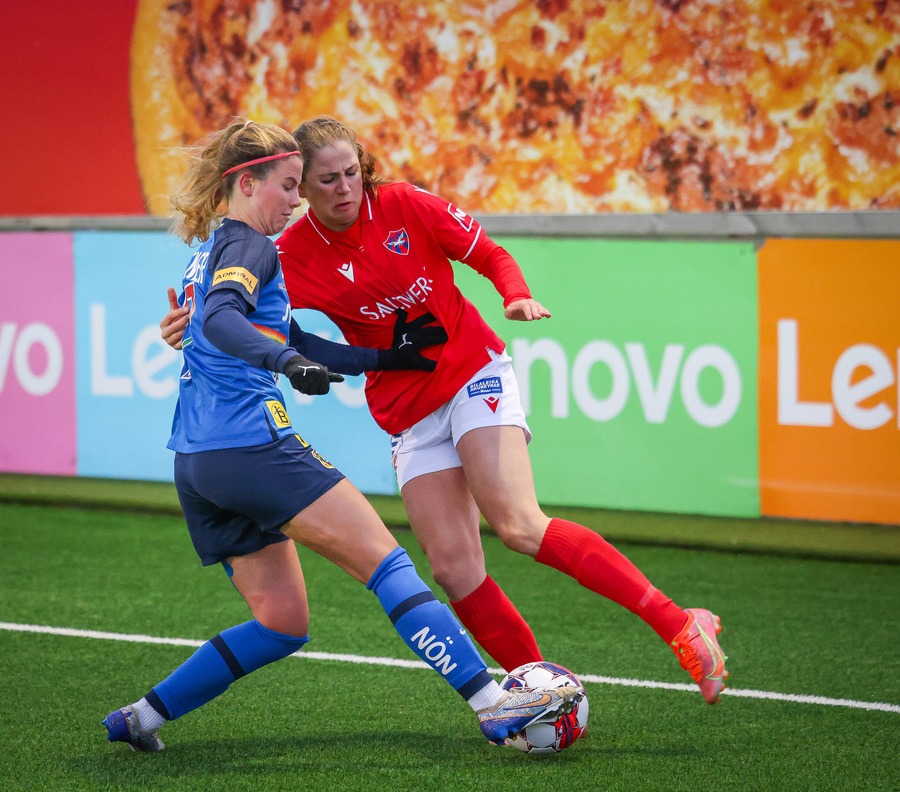 Sarah Mattner fær sendingu inn fyrir en Fanney er vel á verði og er á undan í boltann.