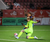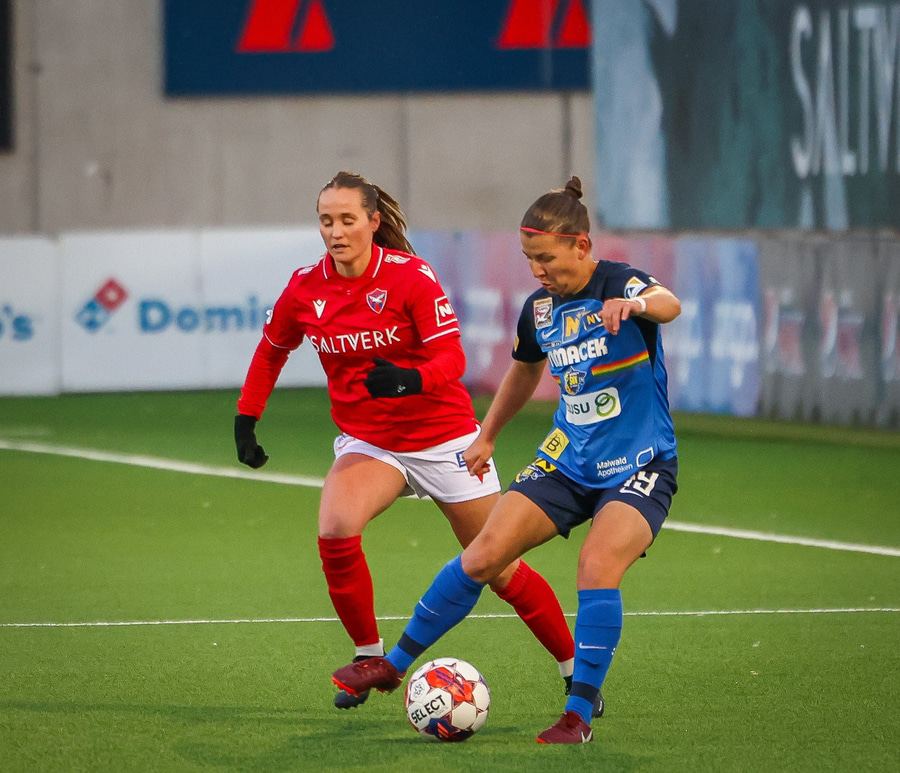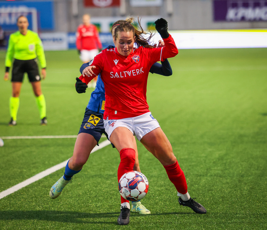 Amanda fer illa með varnarmann St. Pölten áður en hún lætur vaða af löngu færi en skotið er kraftlítið og Carina Schlüter ver örugglega.