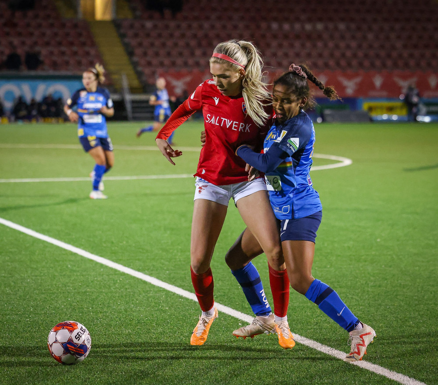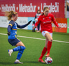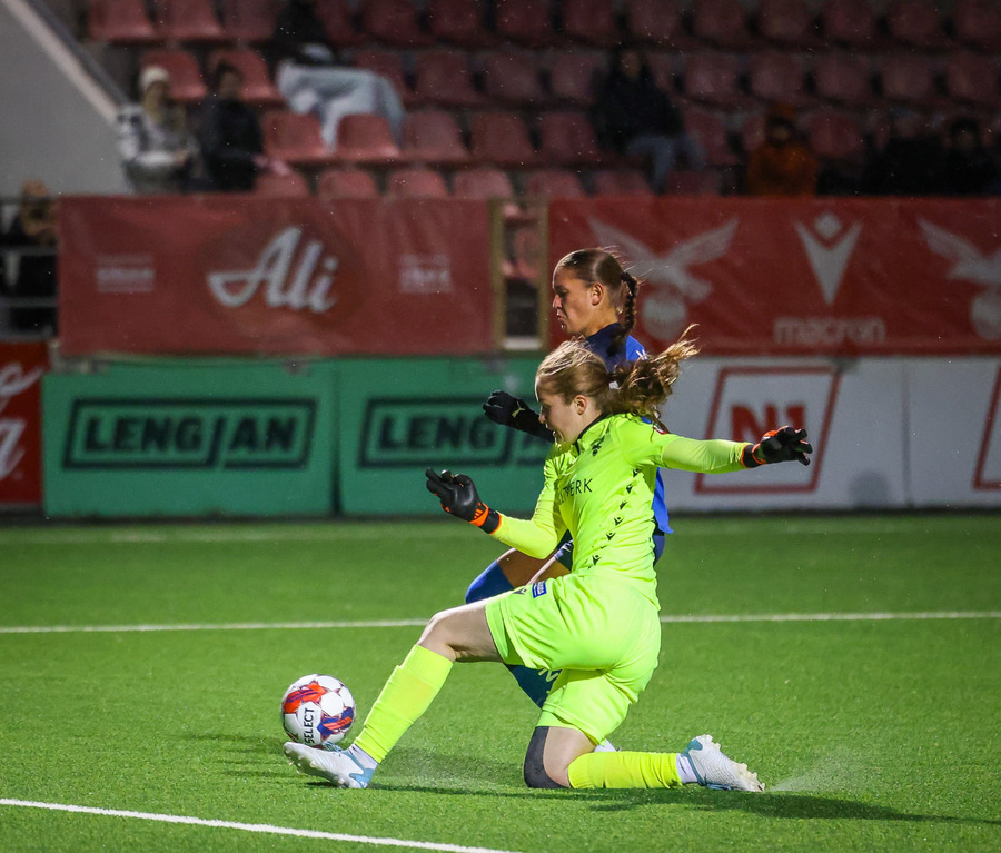 Berglind Rós skyndilega að sleppa í gegn en Carina Schlüter gerir vel og er fyrst í boltann.