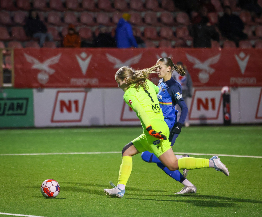 Mateja Zver ber boltann upp völlinn áður en hún rennir honum á Mária Mikolajová sem lætur vaða og Fanney þarf að hafa sig alla við að verja í horn.
